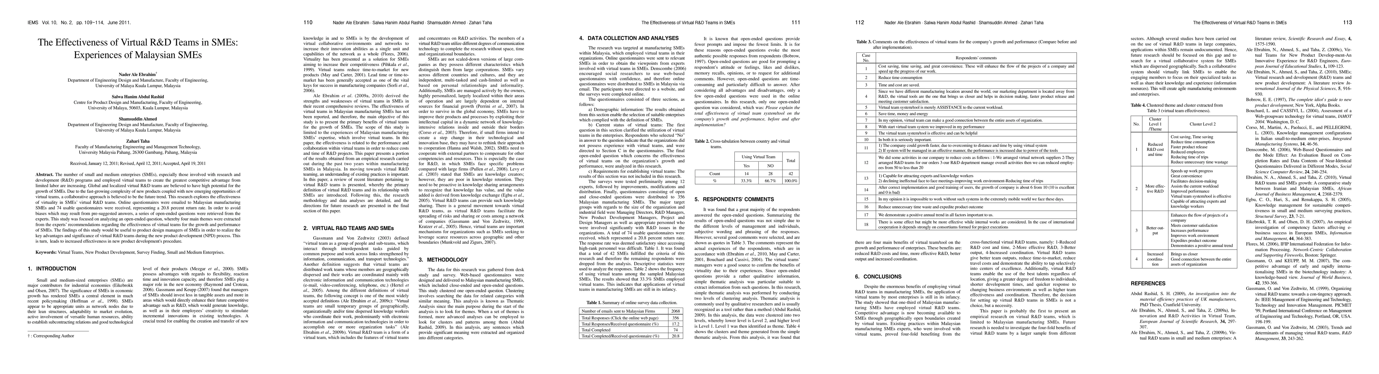This study investigates the effectiveness of virtual R&D teams in Malaysian SMEs, finding that virtual teams enhance growth and performance through collaborative approaches. The research, based on open-ended questionnaire responses from 74 SMEs, reveals key advantages for new product development.