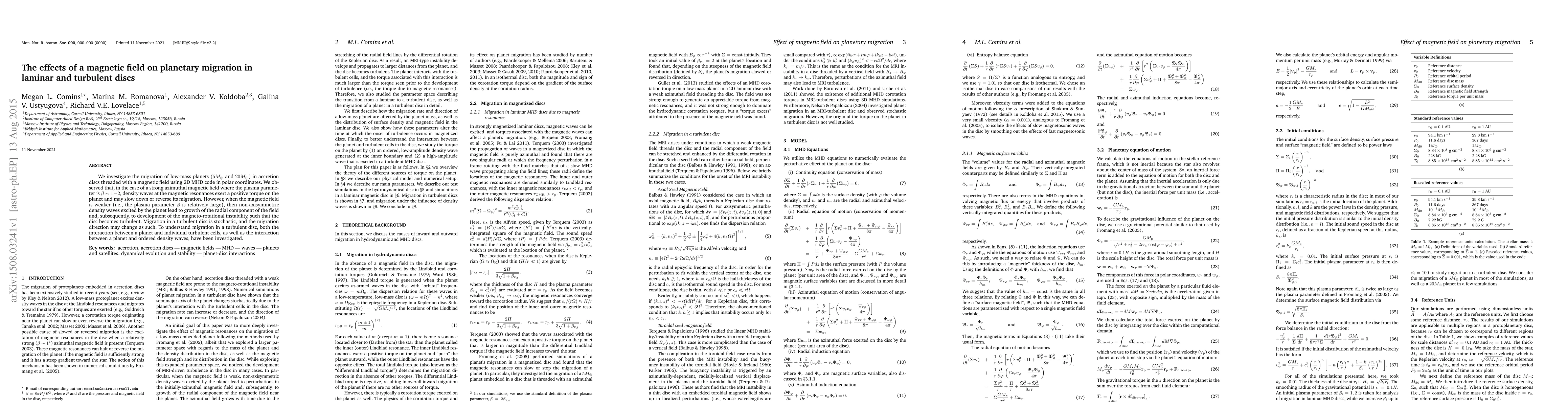 This paper examines the impact of magnetic fields on the migration of low-mass planets in accretion discs, finding that strong magnetic fields can slow down or reverse planetary migration through density waves, while weaker fields induce turbulence and stochastic migration due to magneto-rotational instability.