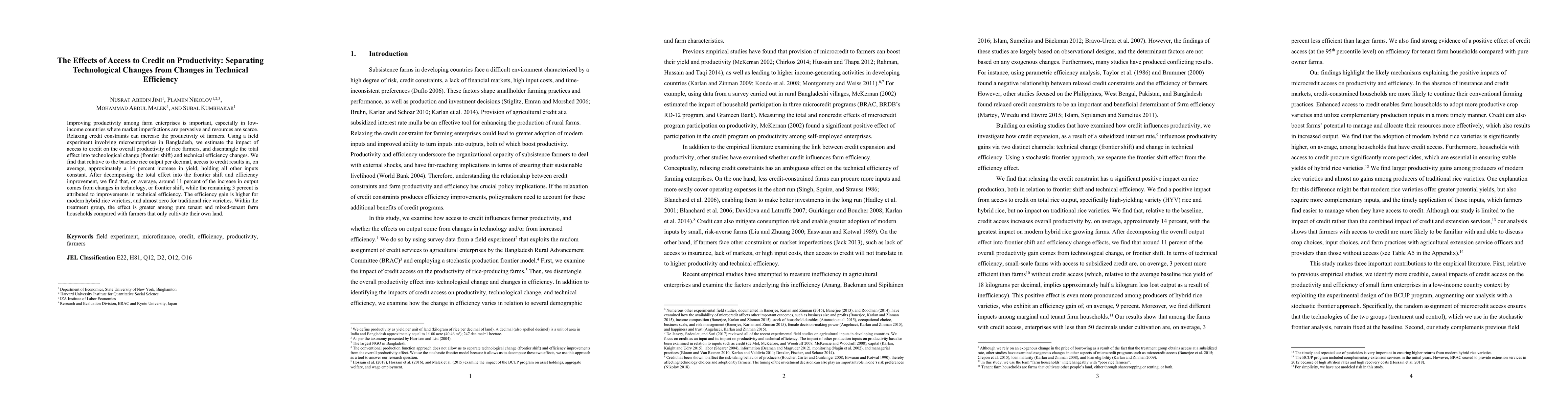 A field experiment was conducted in Bangladesh, randomly assigning access to credit among rice farm microenterprises to estimate the impact on productivity. The study disentangled the total effect into technological changes (frontier shift) and technical efficiency changes using a stochastic production frontier model.