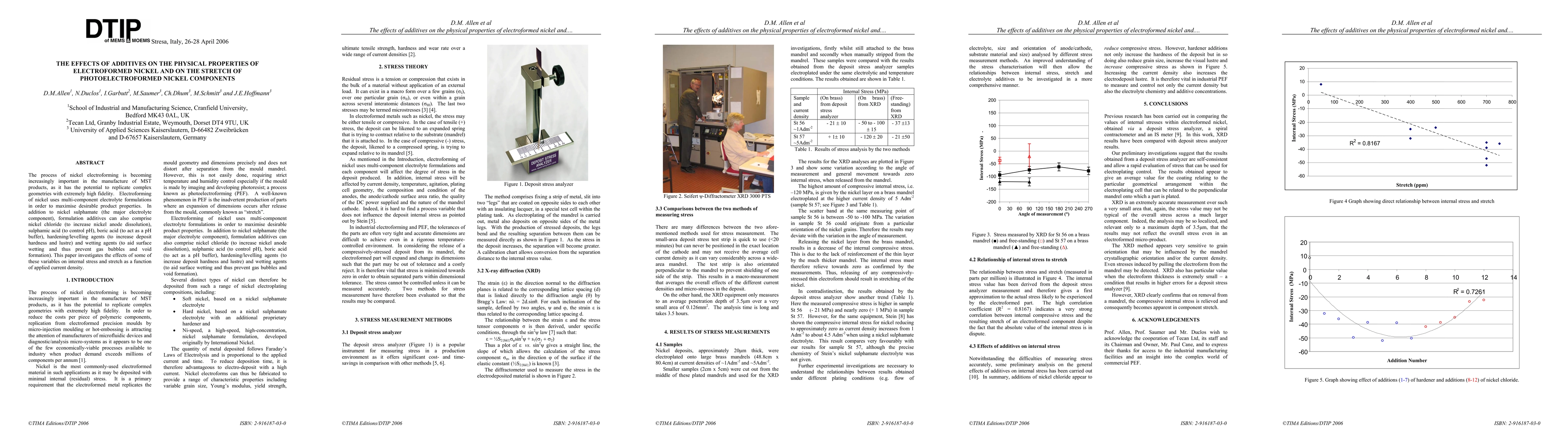 This research explores how various additives in nickel electroforming electrolytes impact the material's internal stress and stretch, particularly under different current densities. It highlights the role of components like nickel chloride, sulphamic acid, boric acid, hardening agents, and wetting agents in shaping the final product's properties, crucial for manufacturing complex MST components.