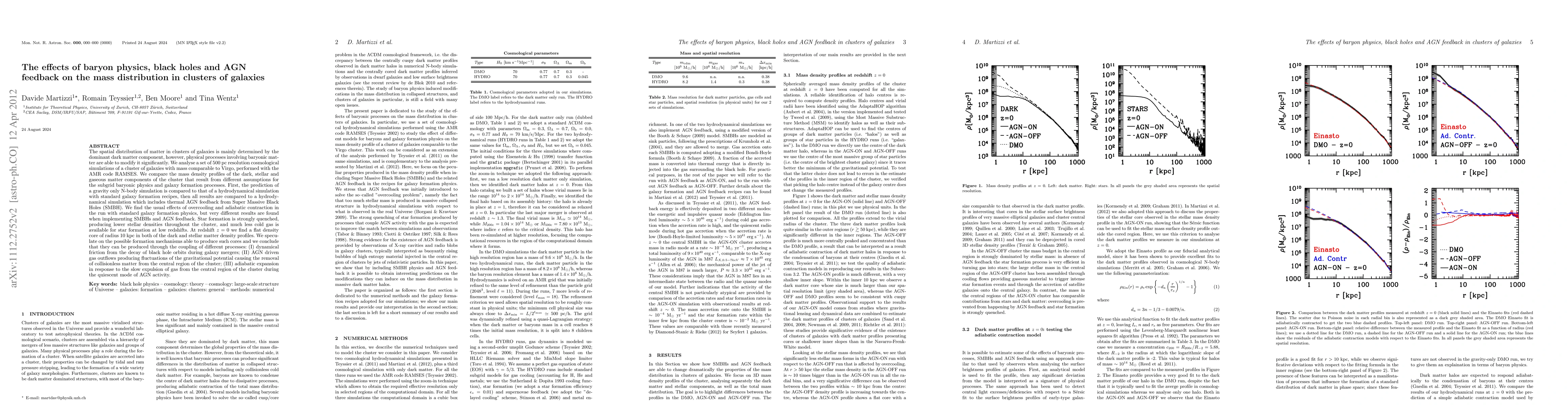 The spatial distribution of matter in clusters of galaxies is mainly determined by the dominant dark matter component, however, physical processes involving baryonic matter are able to modify it significantly. We analyse a set of 500 pc resolution cosmological simulations of a cluster of galaxies with mass comparable to Virgo, performed with the AMR code RAMSES. We compare the mass density profiles of the dark, stellar and gaseous matter components of the cluster that result from different assumptions for the subgrid baryonic physics and galaxy formation processes. First, the prediction of a gravity only N-body simulation is compared to that of a hydrodynamical simulation with standard galaxy formation recipes, then all results are compared to a hydrodynamical simulation which includes thermal AGN feedback from Super Massive Black Holes (SMBH). We find the usual effects of overcooling and adiabatic contraction in the run with standard galaxy formation physics, but very different results are found when implementing SMBHs and AGN feedback. Star formation is strongly quenched, producing lower stellar densities throughout the cluster, and much less cold gas is available for star formation at low redshifts. At redshift z = 0 we find a flat density core of radius 10 kpc in both of the dark and stellar matter density profiles. We specu- late on the possible formation mechanisms able to produce such cores and we conclude that they can be produced through the coupling of different processes: (I) dynamical friction from the decay of black hole orbits during galaxy mergers; (II) AGN driven gas outflows producing fluctuations of the gravitational potential causing the removal of collisionless matter from the central region of the cluster; (III) adiabatic expansion in response to the slow expulsion of gas from the central region of the cluster during the quiescent mode of AGN activity.