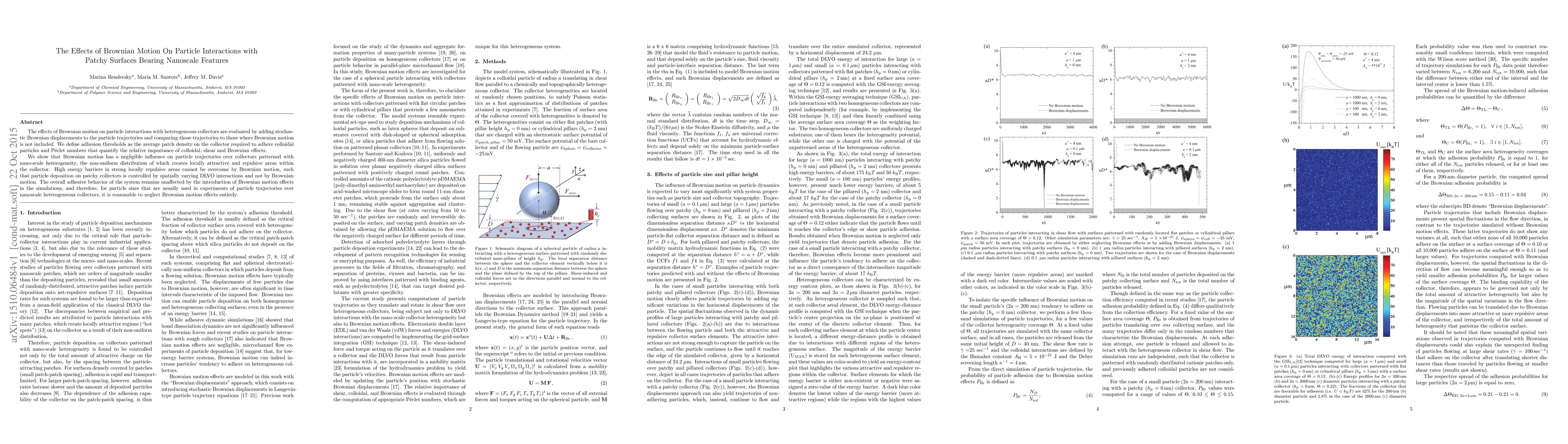 The effects of Brownian motion on particle interactions with heterogeneous collectors are evaluated by adding stochastic Brownian displacements to the particle trajectories and comparing those trajectories to those where Brownian motion is not included. We define adhesion thresholds as the average patch density on the collector required to adhere colloidal particles and P\'{e}clet numbers that quantify the relative importance of colloidal, shear and Brownian effects. We show that Brownian motion has a negligible influence on particle trajectories over collectors patterned with nano-scale heterogeneity, the non-uniform distribution of which creates locally attractive and repulsive areas within the collector. High energy barriers in strong locally repulsive areas cannot be overcome by Brownian motion, such that particle deposition on patchy collectors is controlled by spatially varying DLVO interactions and not by Brownian motion. The overall adhesive behavior of the system remains unaffected by the introduction of Brownian motion effects in the simulations, and therefore, for particle sizes that are usually used in experiments of particle trajectories over nanoscale heterogeneous collectors, it is reasonable to neglect Brownian motion effects entirely.