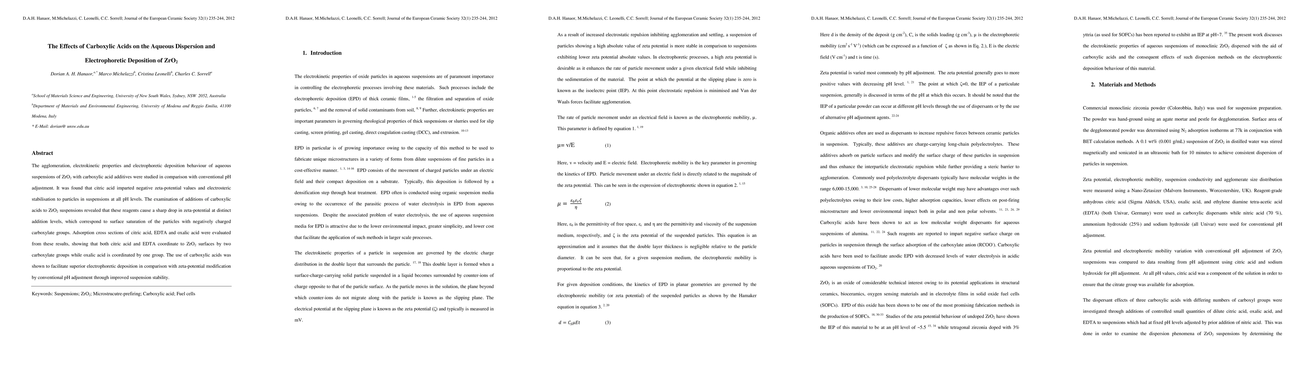 The agglomeration, electrokinetic properties and electrophoretic deposition behaviour of aqueous suspensions of ZrO2 with carboxylic acid additives were studied in comparison with conventional pH adjustment. It was found that citric acid imparted negative zeta-potential values and electrosteric stabilisation to particles in suspensions at all pH levels. The examination of additions of carboxylic acids to ZrO2 suspensions revealed that these reagents cause a sharp drop in zeta-potential at distinct addition levels, which correspond to surface saturation of the particles with negatively charged carboxylate groups. Adsorption cross sections of citric acid, EDTA and oxalic acid were evaluated from these results, showing that both citric acid and EDTA coordinate to ZrO2 surfaces by two carboxylate groups while oxalic acid is coordinated by one group. The use of carboxylic acids was shown to facilitate superior electrophoretic deposition in comparison with zeta-potential modification by conventional pH adjustment through improved suspension stability.