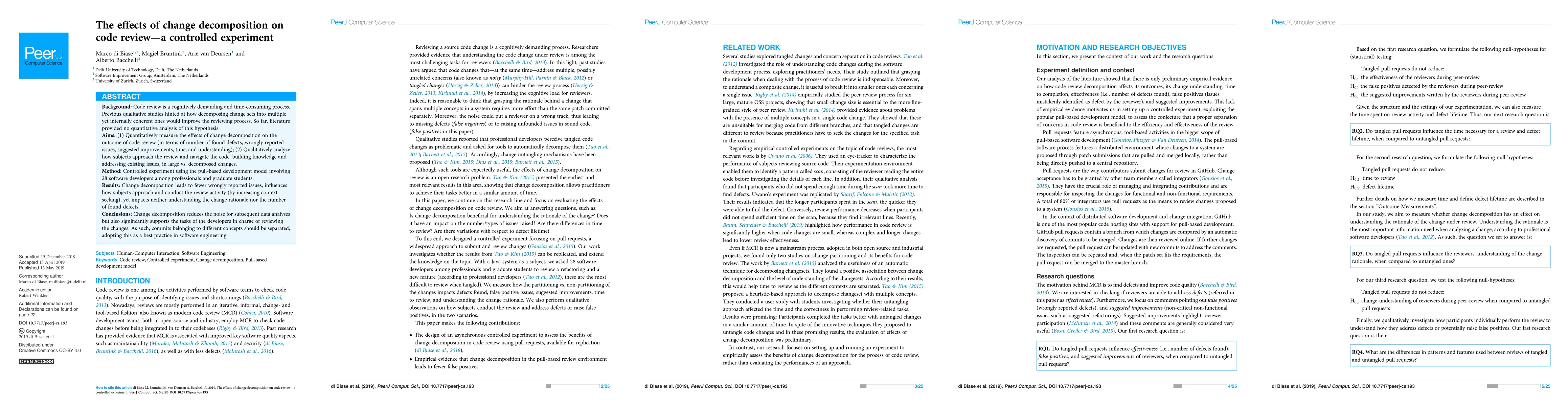 Background: Code review is a cognitively demanding and time-consuming process. Previous qualitative studies hinted at how decomposing change sets into multiple yet internally coherent ones would improve the reviewing process. So far, literature provided no quantitative analysis of this hypothesis. Aims: (1) Quantitatively measure the effects of change decomposition on the outcome of code review (in terms of number of found defects, wrongly reported issues, suggested improvements, time, and understanding); (2) Qualitatively analyze how subjects approach the review and navigate the code, building knowledge and addressing existing issues, in large vs. decomposed changes. Method: Controlled experiment using the pull-based development model involving 28 software developers among professionals and graduate students. Results: Change decomposition leads to fewer wrongly reported issues, influences how subjects approach and conduct the review activity (by increasing context-seeking), yet impacts neither understanding the change rationale nor the number of found defects. Conclusions: Change decomposition reduces the noise for subsequent data analyses but also significantly supports the tasks of the developers in charge of reviewing the changes. As such, commits belonging to different concepts should be separated, adopting this as a best practice in software engineering.