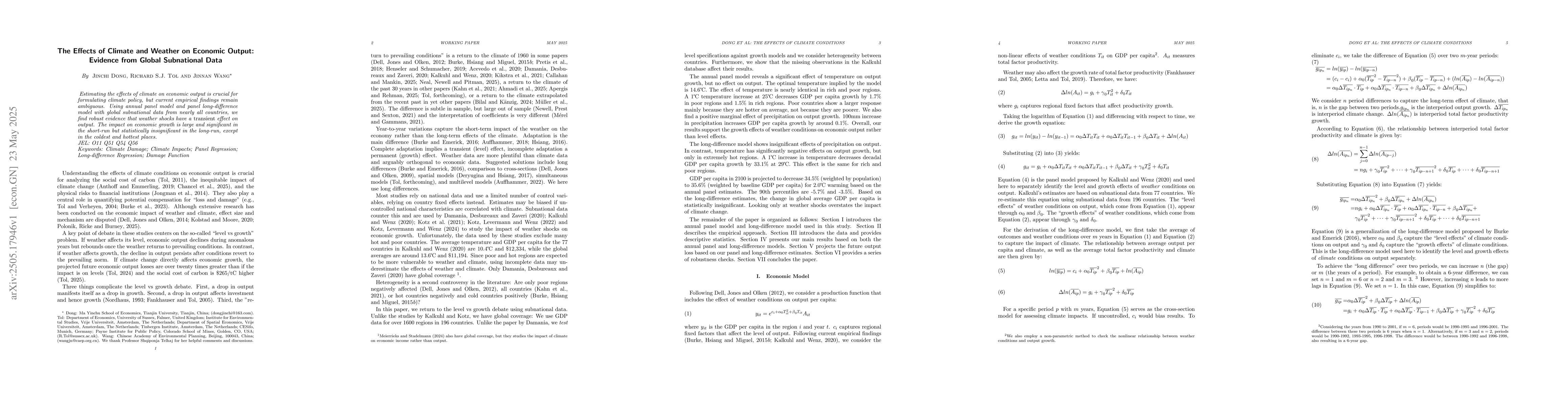 Estimating the effects of climate on economic output is crucial for formulating climate policy, but current empirical findings remain ambiguous. Using annual panel model and panel long-difference model with global subnational data from nearly all countries, we find robust evidence that weather shocks have a transient effect on output. The impact on economic growth is large and significant in the short-run but statistically insignificant in the long-run, except in the coldest and hottest places.