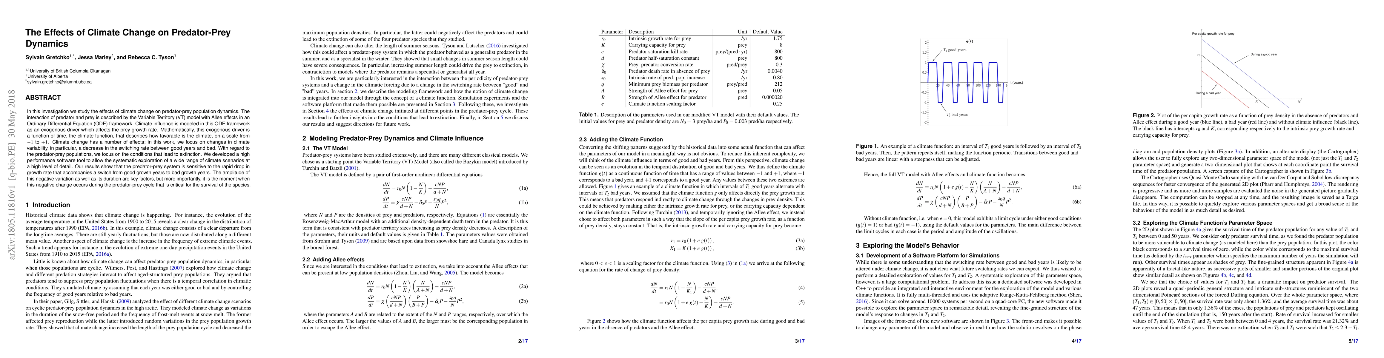 In this investigation we study the effects of climate change on predator-prey population dynamics. The interaction of predator and prey is described by the Variable Territory (VT) model with Allee effects in an Ordinary Differential Equation (ODE) framework. Climate influence is modeled in this ODE framework as an exogenous driver which affects the prey growth rate. Mathematically, this exogenous driver is a function of time, the climate function, that describes how favorable is the climate, on a scale from $-1$ to $+1$. Climate change has a number of effects; in this work, we focus on changes in climate variability, in particular, a decrease in the switching rate between good years and bad. With regard to the predator-prey populations, we focus on the conditions that lead to extinction. We developed a high performance software tool to allow the systematic exploration of a wide range of climate scenarios at a high level of detail. Our results show that the predator-prey system is sensitive to the rapid drop in growth rate that accompanies a switch from good growth years to bad growth years. The amplitude of this negative variation as well as its duration are key factors, but more importantly, it is the moment when this negative change occurs during the predator-prey cycle that is critical for the survival of the species.