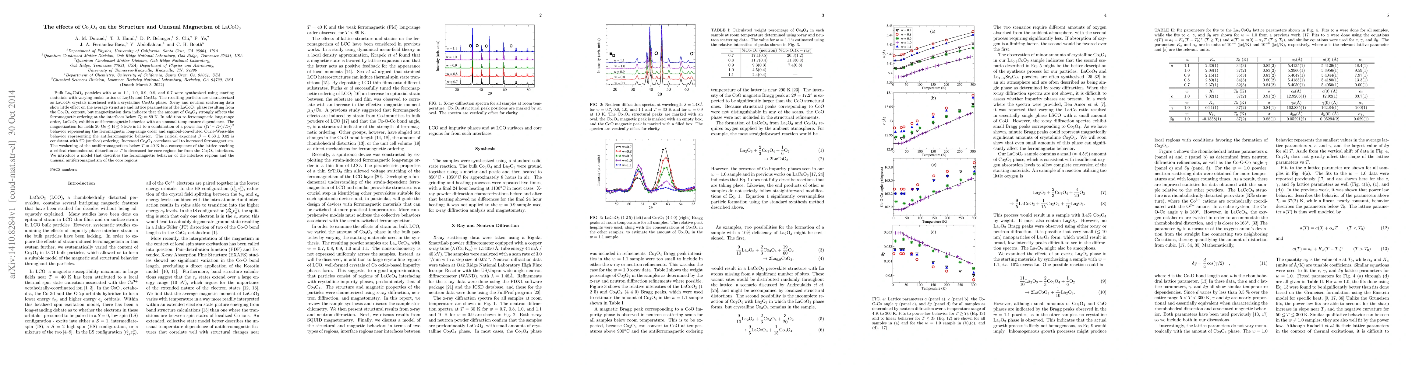 This study investigates the impact of Co3O4 on LaCoO3's structure and magnetism. Synthesizing La_wCoO3 with varying La2O3 and Co3O4 ratios, researchers found that while Co3O4 content doesn't significantly alter LaCoO3's average structure, it greatly influences ferromagnetic ordering below ~89K. The material exhibits unusual antiferromagnetism with temperature-dependent behavior, which weakens below ~40K due to rhombahedral lattice distortion. A model is proposed to describe ferromagnetic interfacial regions and unusual antiferromagnetic core regions' behavior.