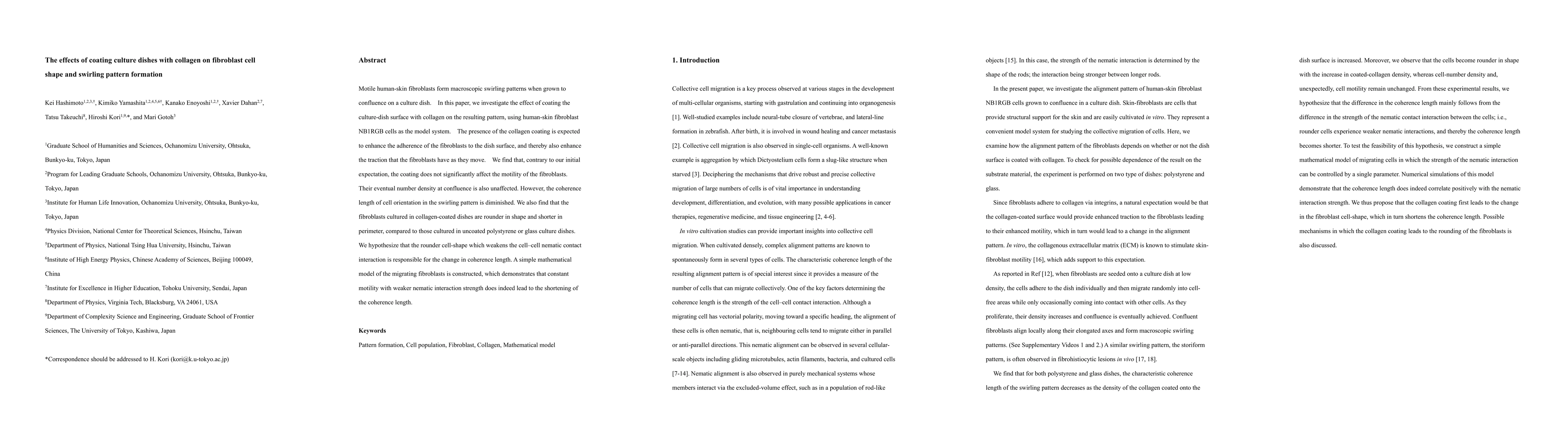 This study examines how collagen coating on culture dishes affects fibroblast cell shape and swirling pattern formation. Contrary to expectations, collagen coating does not significantly impact fibroblast motility or confluence density but reduces the coherence length of cell orientation in swirling patterns, likely due to the rounder cell shapes observed.