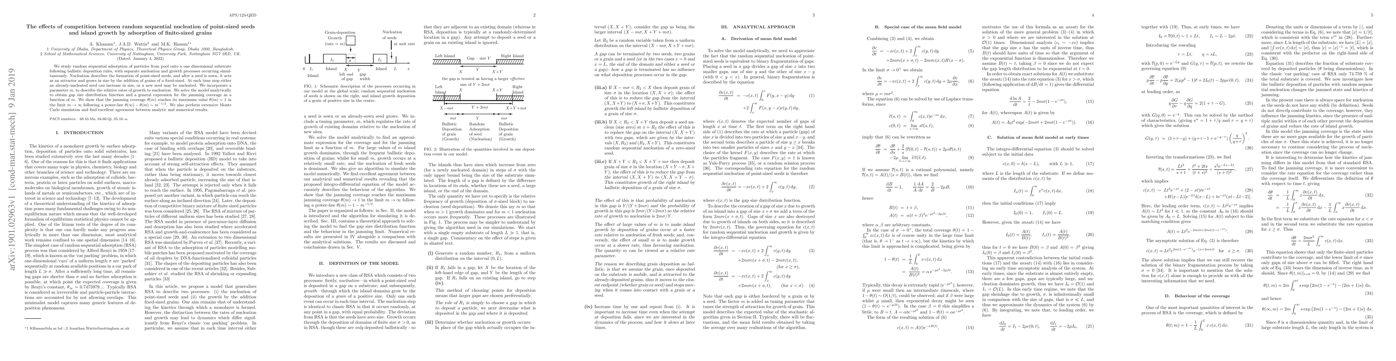 We study random sequential adsorption of particles from pool onto a one dimensional substrate following ballistic deposition rules, with separate nucleation and growth processes occurring simultaneously. Nucleation describes the formation of point-sized seeds, and after a seed is sown, it acts as an attractor and grows in size by the addition of grains of a fixed-sized. At each time step either an already-nucleated seed can increase in size, or a new seed may be nucleated. We incorporate a parameter $m$, to describe the relative rates of growth to nucleation. We solve the model analytically to obtain gap size distribution function and a general expression for the jamming coverage as a function of $m$. We show that the jamming coverage $\theta(m)$ reaches its maximum value $\theta(m)=1$ in the limit $m\rightarrow \infty$ following a power-law $\theta(\infty) - \theta(m) \sim m^{-1/2}$. We also perform extensive Monte Carlo simulation and find excellent agreement between analytic and numerical results.
