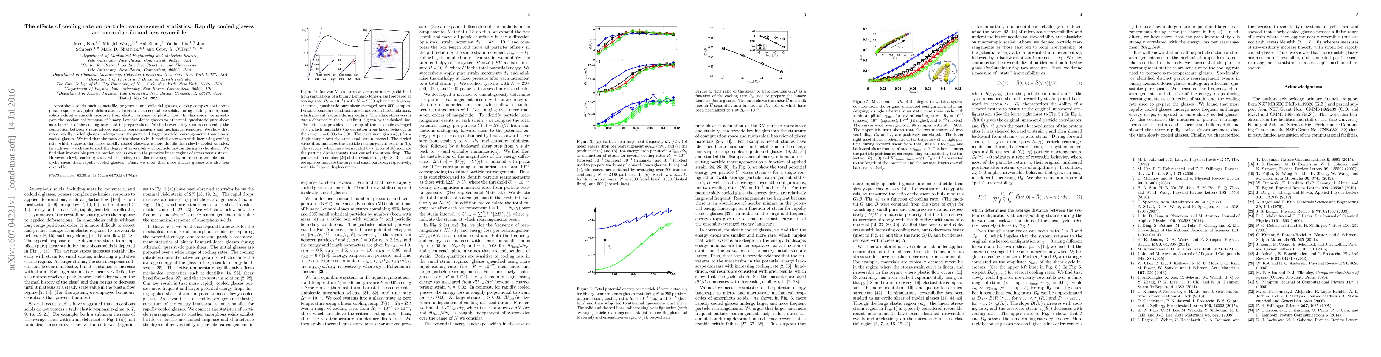 This study investigates how cooling rate affects the mechanical properties of amorphous solids, finding that rapidly cooled glasses exhibit more frequent and larger particle rearrangements, resulting in higher ductility but lower reversibility compared to slowly cooled glasses.