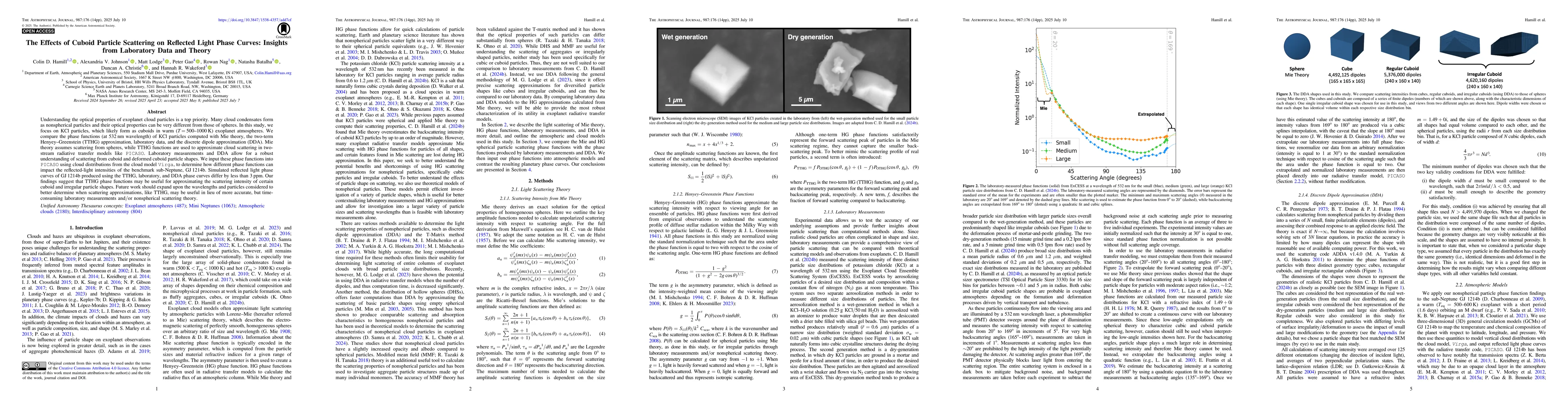 Understanding the optical properties of exoplanet cloud particles is a top priority. Many cloud condensates form as nonspherical particles and their optical properties can be very different from those of spheres. In this study, we focus on KCl particles, which likely form as cuboids in warm (T=500-1000K) exoplanet atmospheres. We compare the phase functions (at 532 nm wavelength) of KCl particles computed with Mie theory, the two-term Henyey-Greenstein (TTHG) approximation, laboratory data, and the discrete dipole approximation (DDA). Mie theory assumes scattering from spheres, while TTHG functions are used to approximate cloud scattering in two-stream radiative transfer models like PICASO. Laboratory measurements and DDA allow for a robust understanding of scattering from cuboid and deformed cuboid particle shapes. We input these phase functions into PICASO using cloud distributions from the cloud model Virga, to determine how different phase functions can impact the reflected-light intensities of the benchmark sub-Neptune, GJ 1214b. Simulated reflected light phase curves of GJ1214b produced using the TTHG, laboratory, and DDA phase curves differ by less than 3ppm. Our findings suggest that TTHG phase functions may be useful for approximating the scattering intensity of certain cuboid and irregular particle shapes. Future work should expand upon the wavelengths and particles considered to better determine when scattering approximations, like TTHG, may be useful in lieu of more accurate, but time-consuming laboratory measurements and/or nonspherical scattering theory.