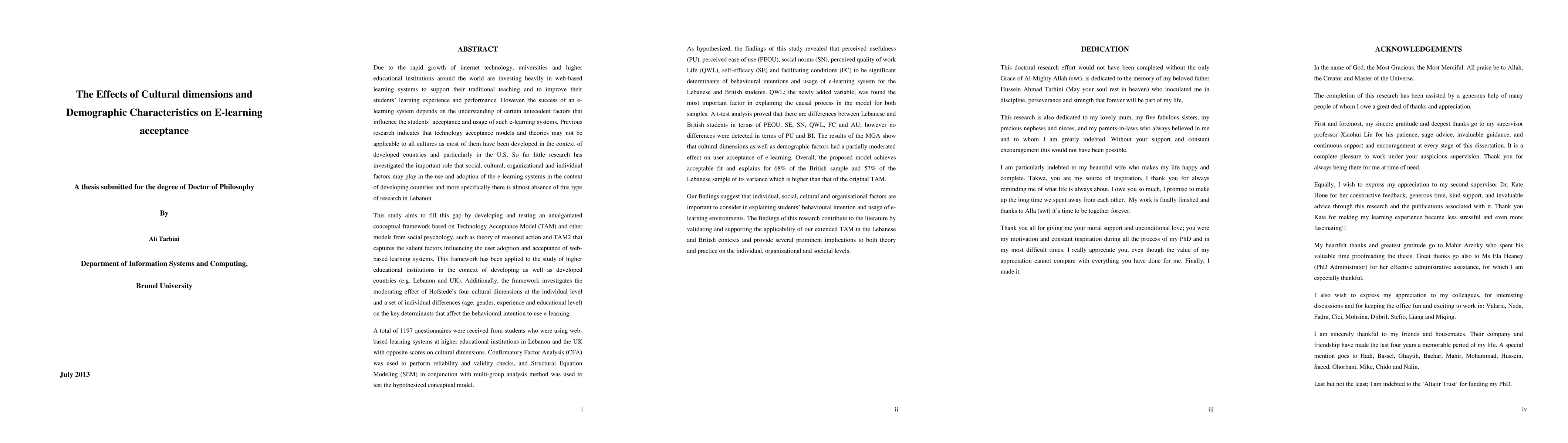 This study develops and tests an extended Technology Acceptance Model (TAM) incorporating social psychology theories to explore e-learning acceptance, considering cultural dimensions and demographic factors. Findings from 1197 students in Lebanon and the UK indicate that individual, social, cultural, and organizational factors significantly influence e-learning behavioral intention.