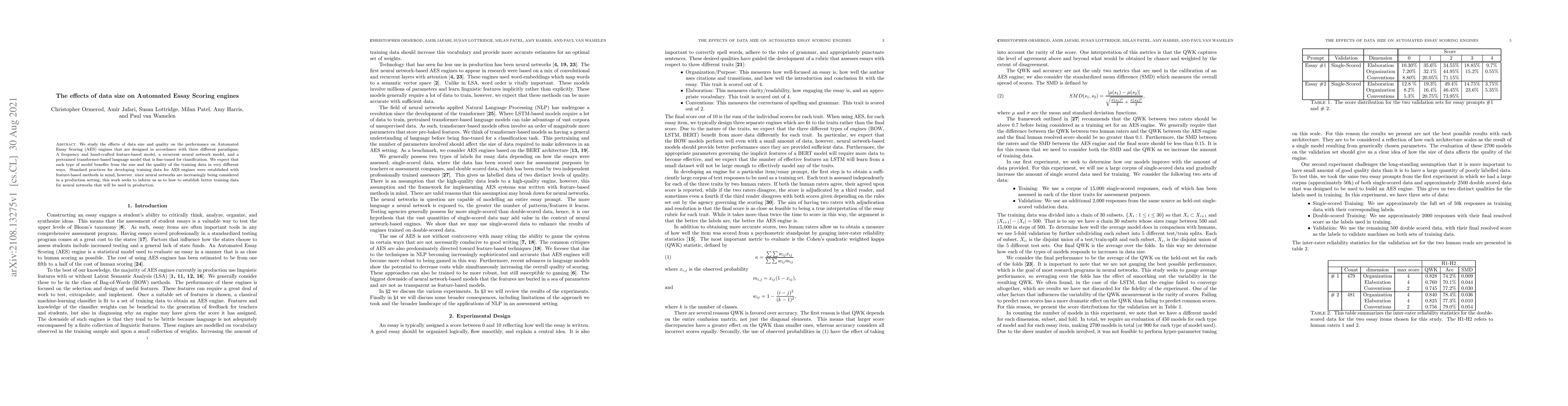 We study the effects of data size and quality on the performance on Automated Essay Scoring (AES) engines that are designed in accordance with three different paradigms; A frequency and hand-crafted feature-based model, a recurrent neural network model, and a pretrained transformer-based language model that is fine-tuned for classification. We expect that each type of model benefits from the size and the quality of the training data in very different ways. Standard practices for developing training data for AES engines were established with feature-based methods in mind, however, since neural networks are increasingly being considered in a production setting, this work seeks to inform us as to how to establish better training data for neural networks that will be used in production.