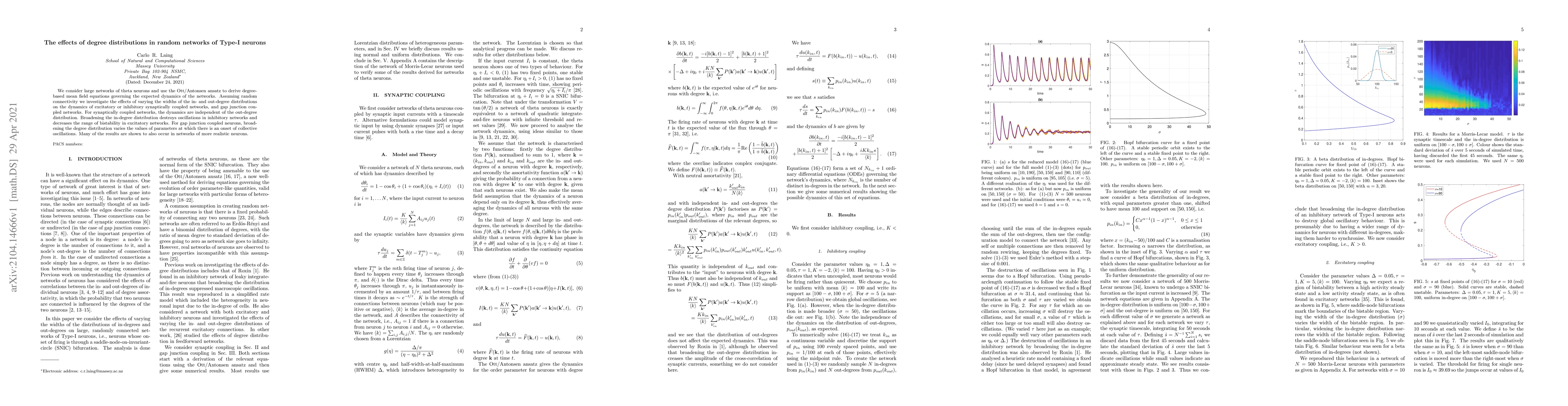 We consider large networks of theta neurons and use the Ott/Antonsen ansatz to derive degree-based mean field equations governing the expected dynamics of the networks. Assuming random connectivity we investigate the effects of varying the widths of the in- and out-degree distributions on the dynamics of excitatory or inhibitory synaptically coupled networks, and gap junction coupled networks. For synaptically coupled networks, the dynamics are independent of the out-degree distribution. Broadening the in-degree distribution destroys oscillations in inhibitory networks and decreases the range of bistability in excitatory networks. For gap junction coupled neurons, broadening the degree distribution varies the values of parameters at which there is an onset of collective oscillations. Many of the results are shown to also occur in networks of more realistic neurons.