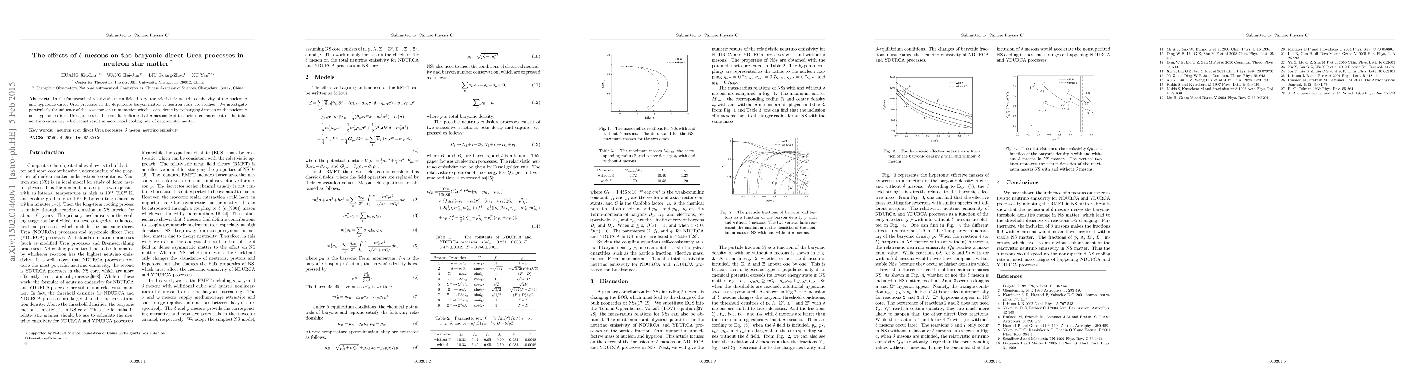 This work extends previous studies by including the effect of $\delta$ mesons, revealing their significant influence on baryon thresholds and neutrino emissivity in neutron star matter.