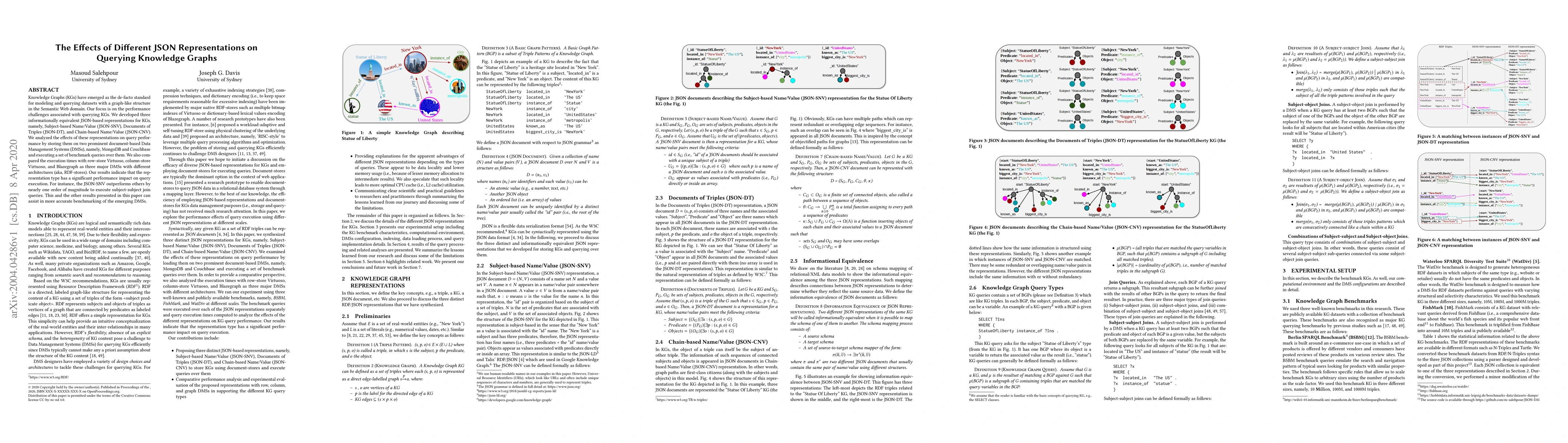 This study investigates the impact of different JSON representations on querying performance in Knowledge Graphs (KGs) using various Document-based Data Management Systems (DMSs). The findings reveal that JSON-SNV representation significantly outperforms others in executing subject-subject join queries, highlighting the importance of representation choice in optimizing query performance.