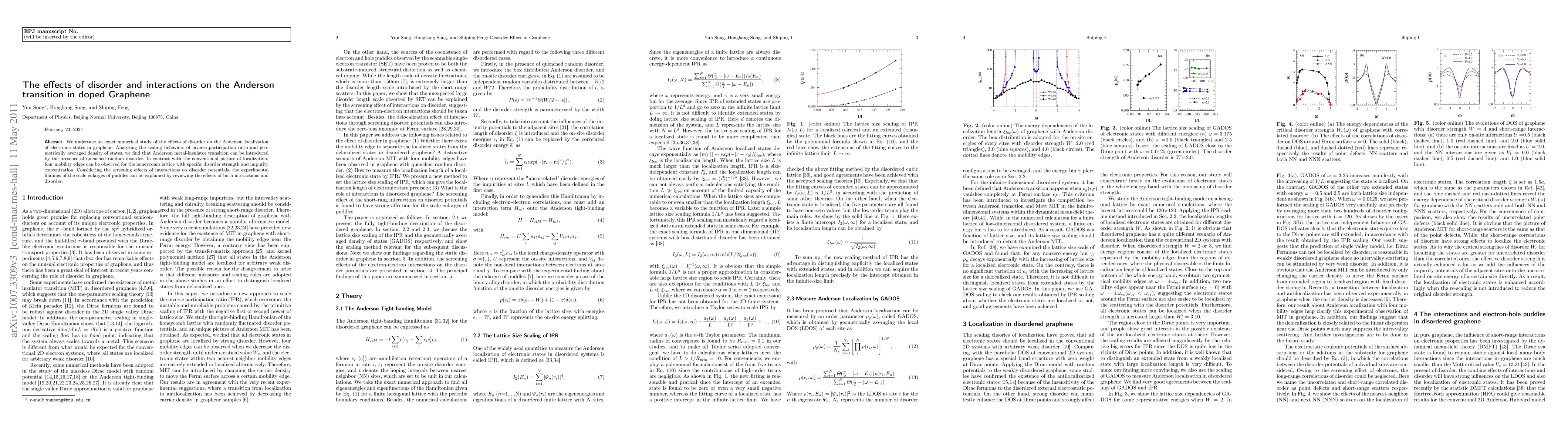 Summary: This study investigates the Anderson transition in doped graphene, revealing that quenched random disorder can induce a metal-insulator transition, characterized by four mobility edges. The research also shows how interactions can screen disorder, explaining the observed scale of puddles in experiments.