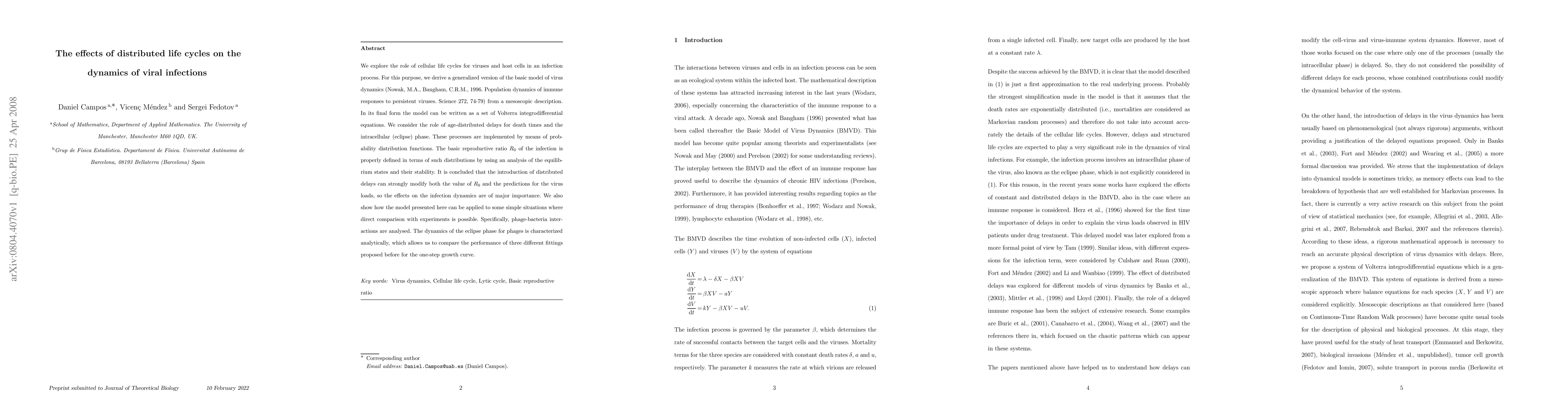 We explore the role of cellular life cycles for viruses and host cells in an infection process. For this purpose, we derive a generalized version of the basic model of virus dynamics (Nowak, M.A., Bangham, C.R.M., 1996. Population dynamics of immune responses to persistent viruses. Science 272, 74-79) from a mesoscopic description. In its final form the model can be written as a set of Volterra integrodifferential equations. We consider the role of age-distributed delays for death times and the intracellular (eclipse) phase. These processes are implemented by means of probability distribution functions. The basic reproductive ratio $R_0$ of the infection is properly defined in terms of such distributions by using an analysis of the equilibrium states and their stability. It is concluded that the introduction of distributed delays can strongly modify both the value of $R_0$ and the predictions for the virus loads, so the effects on the infection dynamics are of major importance. We also show how the model presented here can be applied to some simple situations where direct comparison with experiments is possible. Specifically, phage-bacteria interactions are analysed. The dynamics of the eclipse phase for phages is characterized analytically, which allows us to compare the performance of three different fittings proposed before for the one-step growth curve.