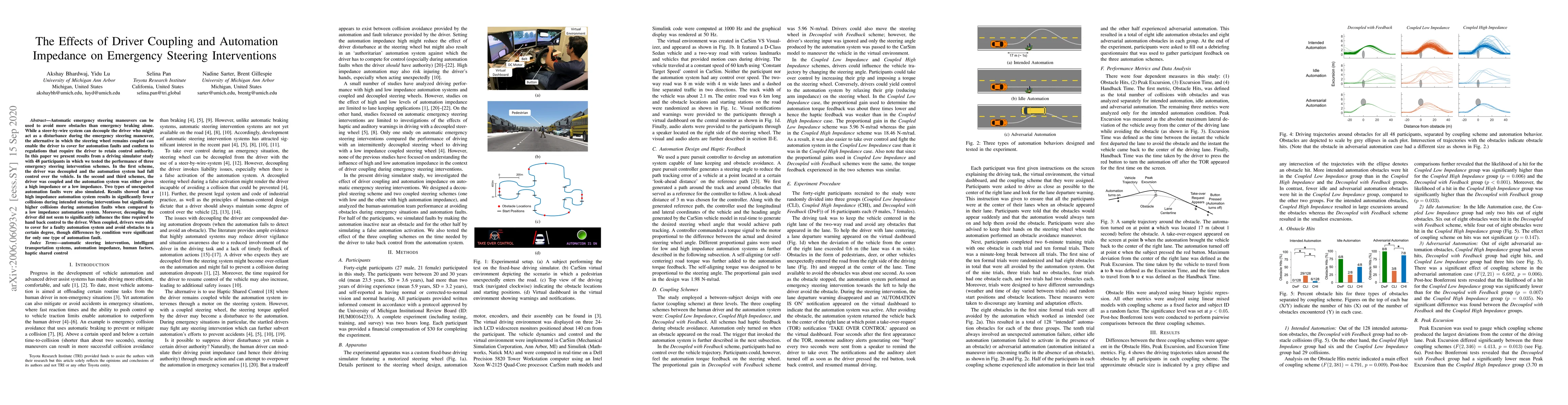 This study investigates the impact of driver coupling and automation impedance on emergency steering interventions using a simulator with 48 participants. Results indicate that high impedance automation reduces collisions during intended interventions but increases them during faults, while driver coupling allows drivers to mitigate automation faults, though not significantly affecting control handover time.