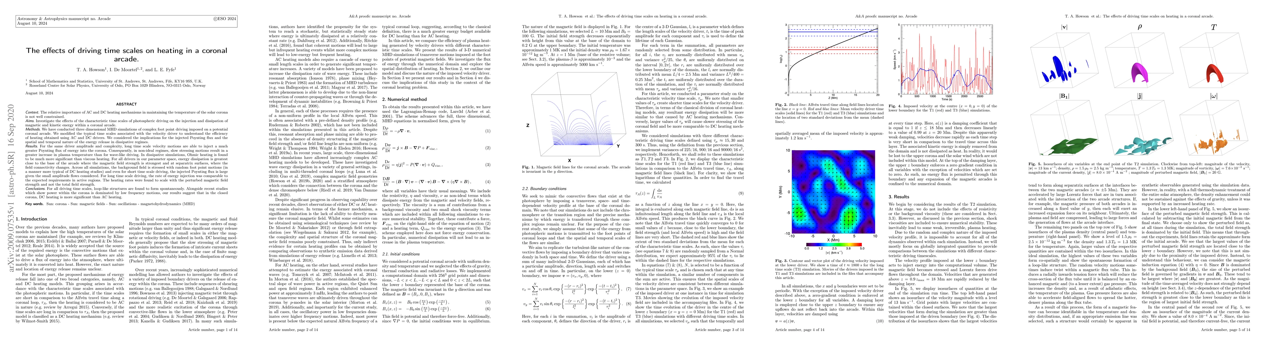 Long time scale driving in a coronal arcade injects more Poynting flux than short time scales, with DC heating being more significant than AC heating, and energy dissipation occurring closest to the base of the arcade.