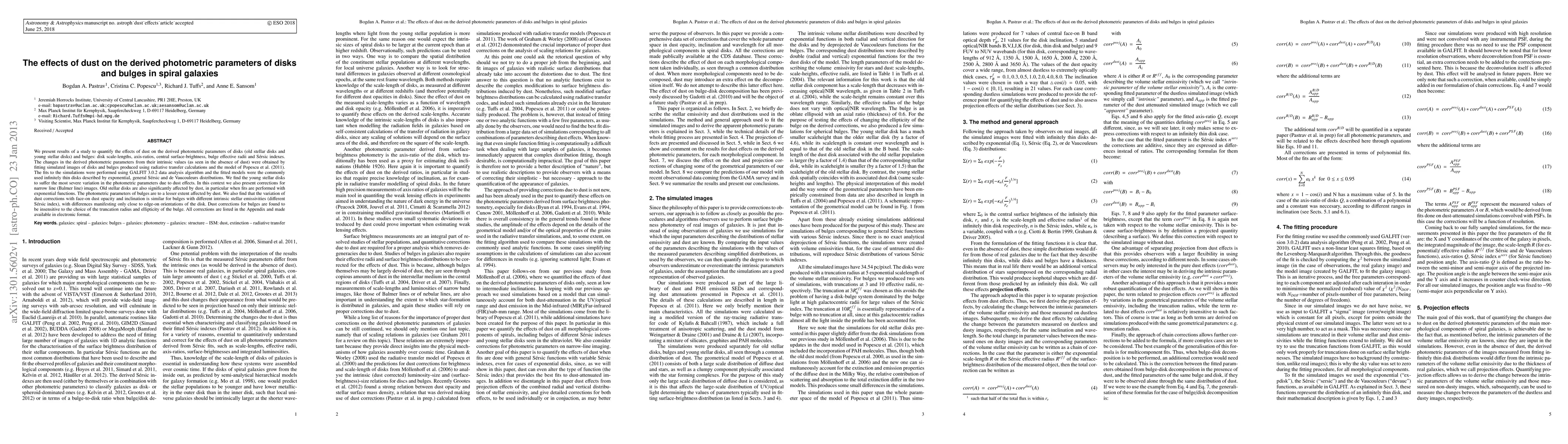 We present results of a study to quantify the effects of dust on the derived photometric parameters of disks (old stellar disks and young stellar disks) and bulges: disk scale-lengths, axis-ratios, central surface-brightness, bulge effective radii and Sersic indexes. The changes in the derived photometric parameters from their intrinsic values (as seen in the absence of dust) were obtained by fitting simulated images of disks and bulges produced using radiative transfer calculations and the model of Popescu et al. (2011). The fits to the simulations were performed using GALFIT 3.0.2 data analysis algorithm and the fitted models were the commonly used infinitely thin disks described by exponential, general Sersic and de Vaucouleurs distributions. We find the young stellar disks to suffer the most severe variation in the photometric parameters due to dust effects. In this context we also present corrections for narrow line (Balmer line) images. Old stellar disks are also significantly affected by dust, in particular when fits are performed with exponential functions. The photometric parameters of bulges are to a lesser extent affected by dust. We also find that the variation of dust corrections with face-on dust opacity and inclination is similar for bulges with different intrinsic stellar emissivities (different Sersic index), with differences manifesting only close to edge-on orientations of the disk. Dust corrections for bulges are found to be insensitive to the choice of the truncation radius and ellipticity of the bulge. All corrections are listed in the Appendix and made available in electronic format.
