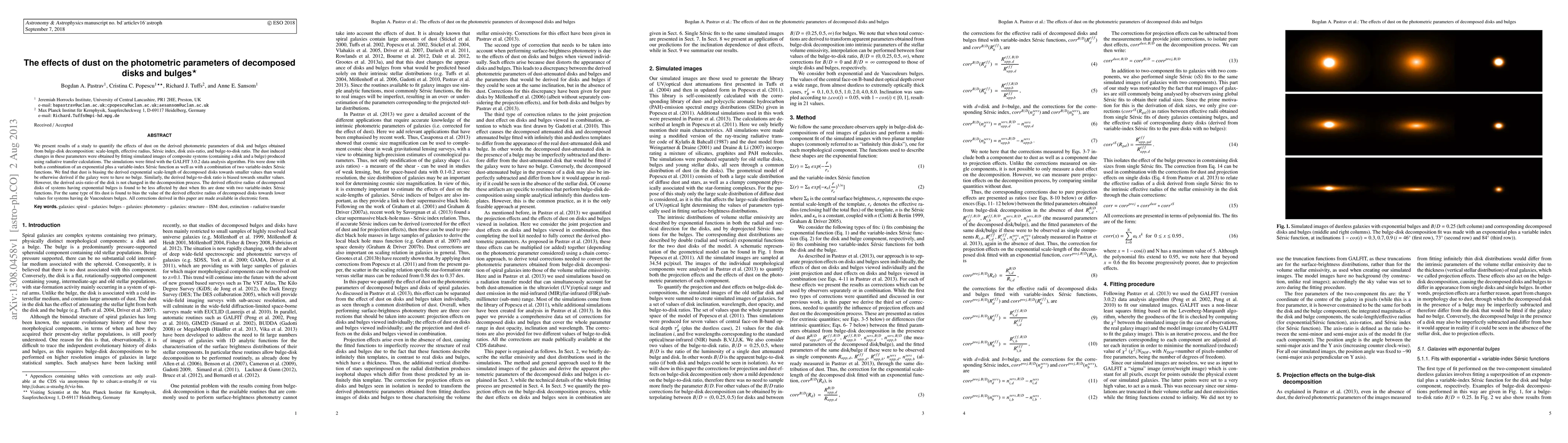 We present results of a study to quantify the effects of dust on the derived photometric parameters of disk and bulges obtained from bulge-disk decomposition: scale-length, effective radius, Sersic index, disk axis-ratio, and bulge-to-disk ratio. The dust induced changes in these parameters were obtained by fitting simulated images of composite systems (containing a disk and a bulge) produced using radiative transfer calculations. The simulations were fitted with the GALFIT 3.0.2 data analysis algorithm. Fits were done with both a combination of an exponential plus a variable-index Sersic function as well as with a combination of two variable-index Sersic functions. We find that dust is biasing the derived exponential scale-length of decomposed disks towards smaller values than would be otherwise derived if the galaxy were to have no bulge. Similarly, the derived bulge-to-disk ratio is biased towards smaller values. However, the derived axis-ratio of the disk is not changed in the decomposition process. The derived effective radius of decomposed disks of systems having exponential bulges is found to be less affected by dust when fits are done with two variable-index Sersic functions. For the same type of fits dust is found to bias the value of the derived effective radius of decomposed disks towards lower values for systems having de Vaucouleurs bulges. All corrections derived in this paper are made available in electronic form.
