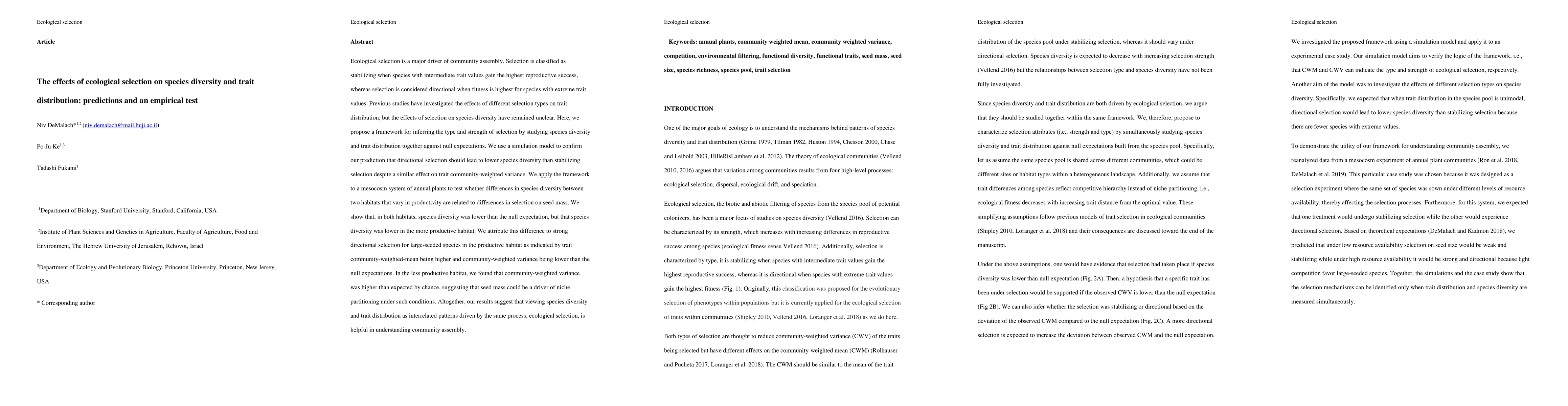 This study investigates how different types of ecological selection influence species diversity and trait distribution in plant communities. The research predicts that directional selection leads to lower species diversity compared to stabilizing selection, and this is confirmed through simulations and empirical tests in mesocosms. The study finds that species diversity is lower in more productive habitats due to strong directional selection favoring large-seeded species, while less productive habitats show higher trait variance, suggesting niche partitioning.