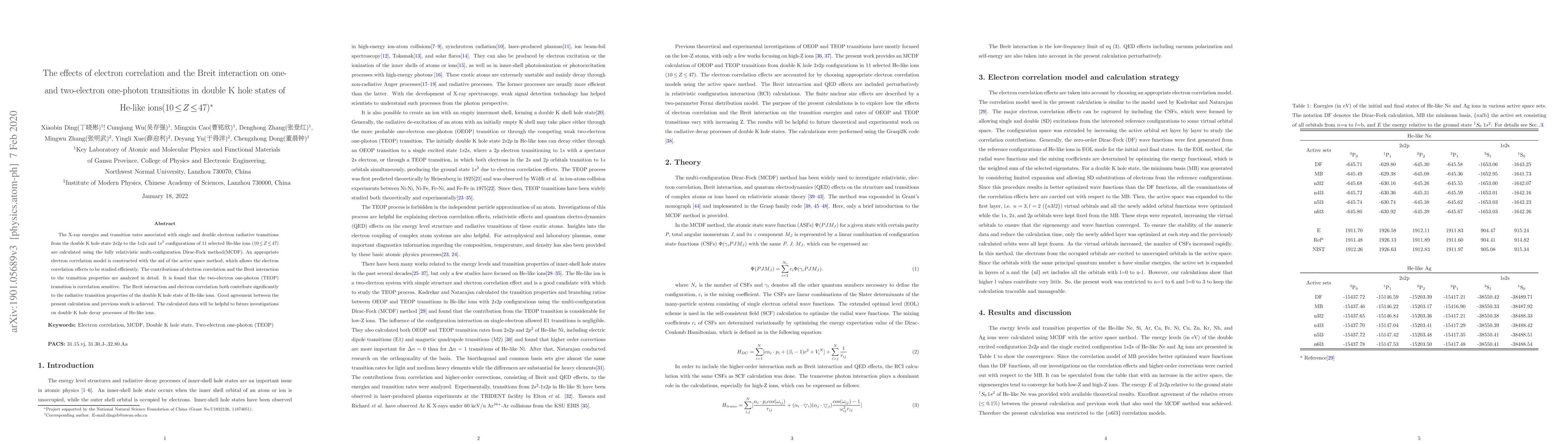 This paper evaluates x-ray energies and transition rates for single and double electron radiative transitions in He-like ions ($10\!\leq\!Z\!\leq\!47$) using the relativistic multi-configuration Dirac-Fock method. It finds significant contributions from electron correlation and the Breit interaction to the transition properties, with the two-electron one-photon transition being particularly sensitive to correlation effects.