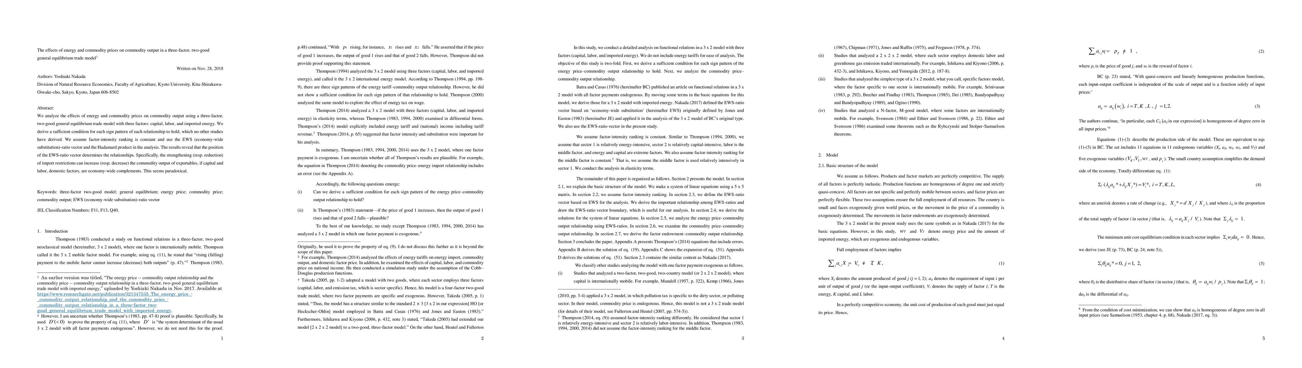 We analyze the effects of energy and commodity prices on commodity output using a three-factor, two-good general equilibrium trade model with three factors: capital, labor, and imported energy. We derive a sufficient condition for each sign pattern of each relationship to hold, which no other studies have derived. We assume factor-intensity ranking is constant and use the EWS (economy-wide substitution)-ratio vector and the Hadamard product in the analysis. The results reveal that the position of the EWS-ratio vector determines the relationships. Specifically, the strengthening (resp. reduction) of import restrictions can increase (resp. decrease) the commodity output of exportables, if capital and labor, domestic factors, are economy-wide complements. This seems paradoxical.