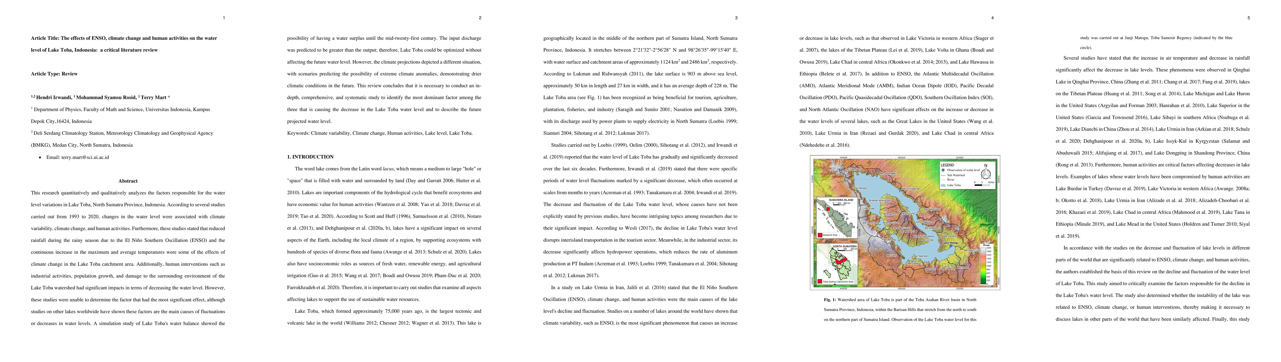 This research quantitatively and qualitatively analyzes the factors responsible for the water level variations in Lake Toba, North Sumatra Province, Indonesia. According to several studies carried out from 1993 to 2020, changes in the water level were associated with climate variability, climate change, and human activities. Furthermore, these studies stated that reduced rainfall during the rainy season due to the El Nino Southern Oscillation (ENSO) and the continuous increase in the maximum and average temperatures were some of the effects of climate change in the Lake Toba catchment area. Additionally, human interventions such as industrial activities, population growth, and damage to the surrounding environment of the Lake Toba watershed had significant impacts in terms of decreasing the water level. However, these studies were unable to determine the factor that had the most significant effect, although studies on other lakes worldwide have shown these factors are the main causes of fluctuations or decreases in water levels. A simulation study of Lake Toba's water balance showed the possibility of having a water surplus until the mid-twenty-first century. The input discharge was predicted to be greater than the output; therefore, Lake Toba could be optimized without affecting the future water level. However, the climate projections depicted a different situation, with scenarios predicting the possibility of extreme climate anomalies, demonstrating drier climatic conditions in the future. This review concludes that it is necessary to conduct an in-depth, comprehensive, and systematic study to identify the most dominant factor among the three that is causing the decrease in the Lake Toba water level and to describe the future projected water level.