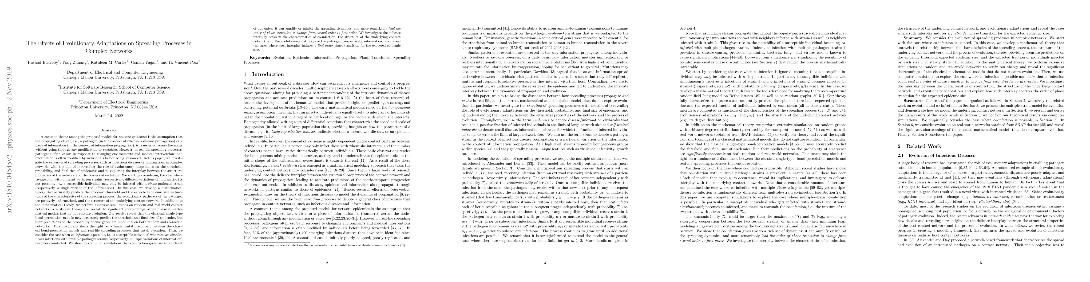 This paper explores how evolutionary adaptations affect spreading processes in complex networks, developing a mathematical theory to predict epidemic thresholds and sizes considering pathogen evolution and network structure. Simulations show classical models' inaccuracy in predicting the probability of epidemic emergence, highlighting the importance of incorporating evolutionary dynamics.