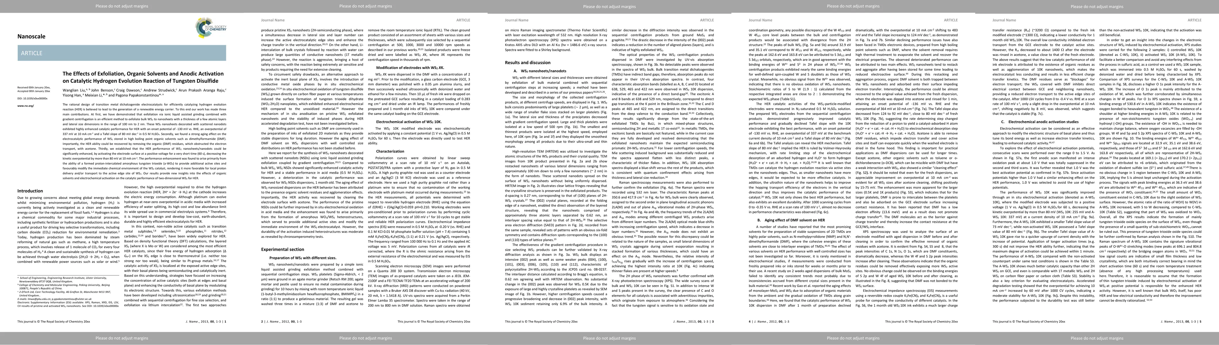 This paper investigates the catalytic hydrogen evolution reaction (HER) of tungsten disulfide (WS2) through exfoliation, solvent effects, and anodic activation. Exfoliation via ionic liquid-assisted grinding enhances HER performance, while exposure to organic solvents like DMF degrades it. Anodic activation for 60 seconds improves HER efficiency by forming proton-intercalated amorphous tungsten trioxide, providing additional active sites.