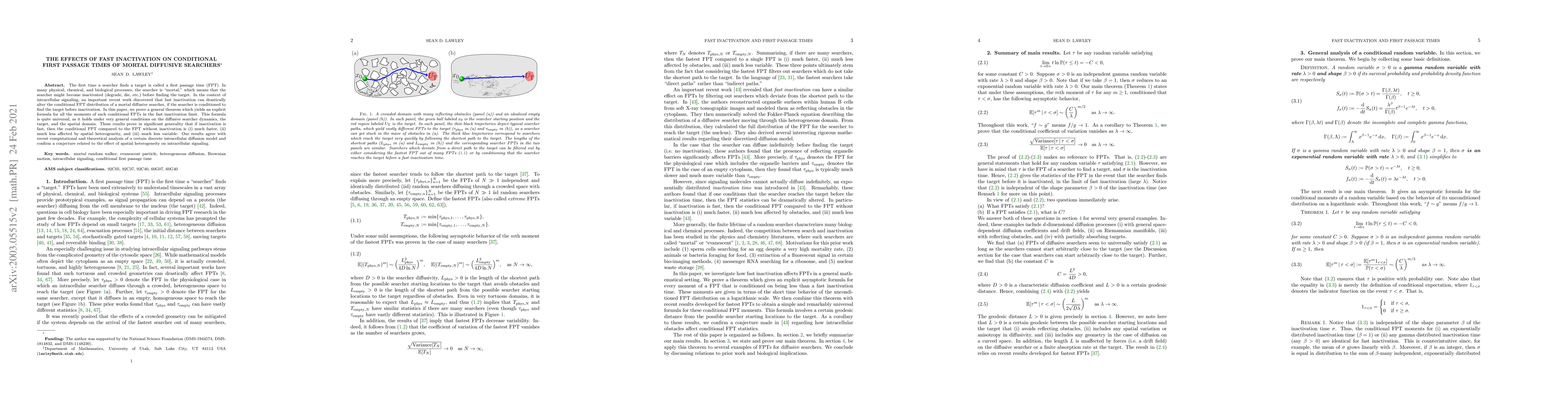 The first time a searcher finds a target is called a first passage time (FPT). In many physical, chemical, and biological processes, the searcher is "mortal," which means that the searcher might become inactivated (degrade, die, etc.) before finding the target. In the context of intracellular signaling, an important recent work discovered that fast inactivation can drastically alter the conditional FPT distribution of a mortal diffusive searcher, if the searcher is conditioned to find the target before inactivation. In this paper, we prove a general theorem which yields an explicit formula for all the moments of such conditional FPTs in the fast inactivation limit. This formula is quite universal, as it holds under very general conditions on the diffusive searcher dynamics, the target, and the spatial domain. These results prove in significant generality that if inactivation is fast, then the conditional FPT compared to the FPT without inactivation is (i) much faster, (ii) much less affected by spatial heterogeneity, and (iii) much less variable. Our results agree with recent computational and theoretical analysis of a certain discrete intracellular diffusion model and confirm a conjecture related to the effect of spatial heterogeneity on intracellular signaling.