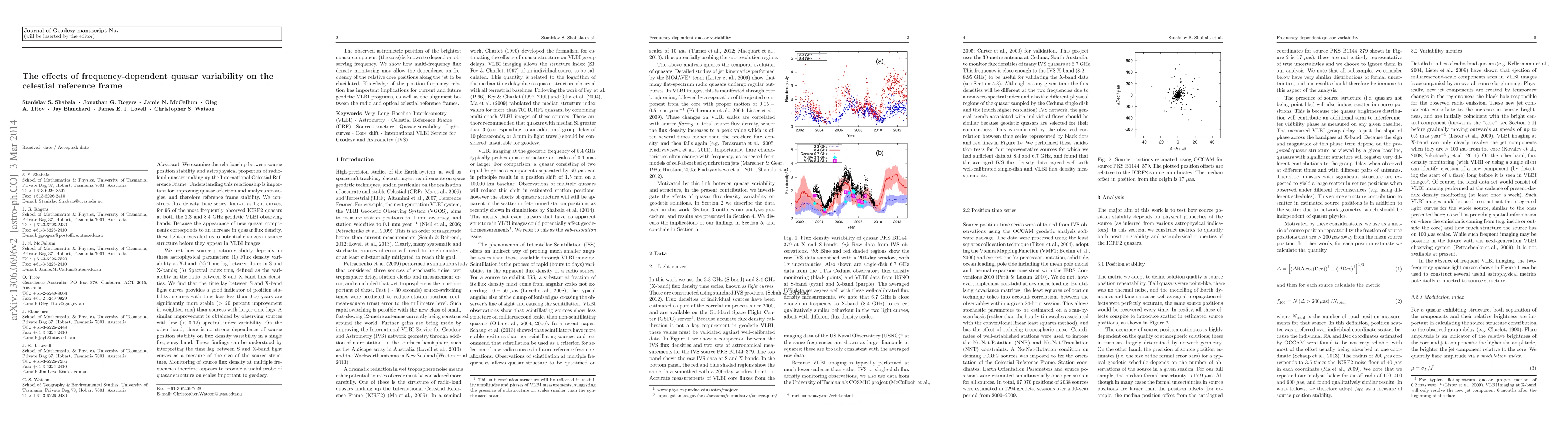 This paper investigates how frequency-dependent quasar variability affects the stability of the celestial reference frame, finding that small time lags and low spectral index variability between S and X-band light curves indicate better quasar position stability. The study suggests that multi-frequency monitoring can reveal the frequency dependence of relative core positions, which is crucial for geodetic VLBI and alignment of radio and optical reference frames.