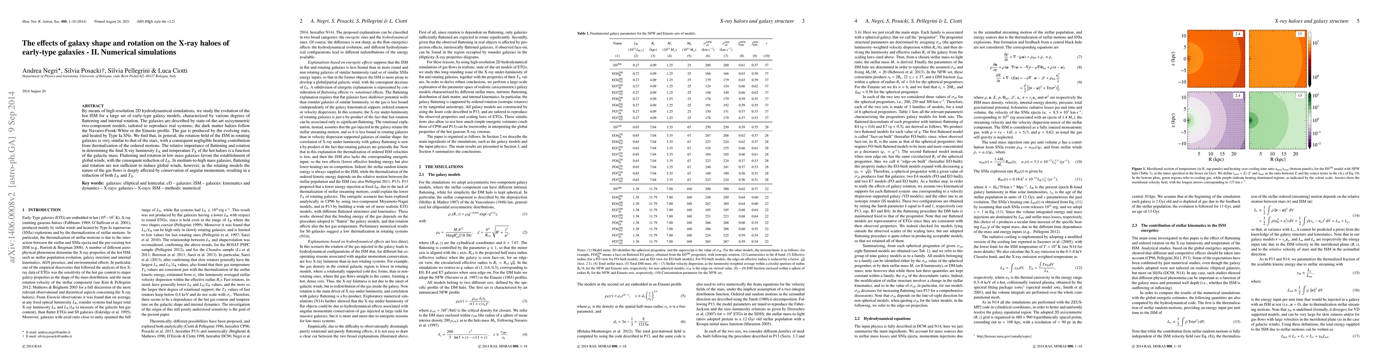 By means of high resolution 2D hydrodynamical simulations, we study the evolution of the hot ISM for a large set of early-type galaxy models, characterized by various degrees of flattening and internal rotation. The galaxies are described by state-of-the-art axisymmetric two-component models, tailored to reproduce real systems; the dark matter haloes follow the Navarro-Frenk-White or the Einasto profile. The gas is produced by the evolving stars, and heated by Type Ia SNe. We find that, in general, the rotation field of the ISM in rotating galaxies is very similar to that of the stars, with a consequent negligible heating contribution from thermalization of the ordered motions. The relative importance of flattening and rotation in determining the final X-ray luminosity $L_x$ and temperature $T_x$ of the hot haloes is a function of the galactic mass. Flattening and rotation in low mass galaxies favour the establishment of global winds, with the consequent reduction of $L_x$. In medium-to-high mass galaxies, flattening and rotation are not sufficient to induce global winds, however, in the rotating models the nature of the gas flows is deeply affected by conservation of angular momentum, resulting in a reduction of both $L_x$ and $T_x$.