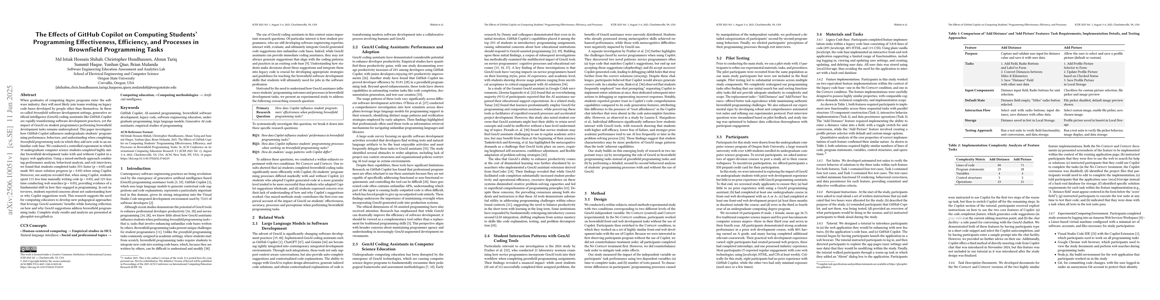 This study examines how GitHub Copilot, a generative AI coding assistant, affects undergraduate computer science students' performance and processes in brownfield programming tasks. Results indicate that students completed tasks 35% faster and made 50% more progress with Copilot, spending less time writing code and searching the web. Students expressed concerns about understanding Copilot's suggestions, suggesting a need for new educational approaches to leverage AI tools effectively.