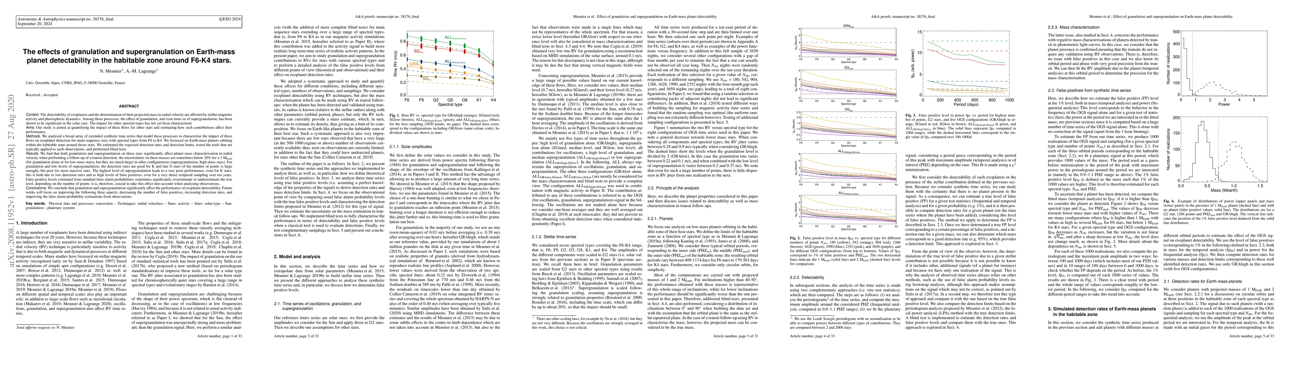 The detectability of exoplanets and the determination of their projected mass in radial velocity are affected by stellar magnetic activity and photospheric dynamics. The effect of granulation, and even more so of supergranulation, has been shown to be significant in the solar case. Our study is aimed at quantifying the impact of these flows for other stars and estimating how such contributions affect their performance. We analysed a broad array of extended synthetic time series that model these processes for main sequence stars with spectral types from F6 to K4, focusing on Earth-mass planets orbiting within the habitable zone around those stars. We estimated the expected detection rates and detection limits, and performed blind tests. We find that both granulation and supergranulation on these stars significantly affect planet mass characterisation in radial velocity when performing a follow-up of a transit detection, with uncertainties sometimes below 20% for a 1 MEarth, but much larger for supergranulation. For granulation and low levels of supergranulation, the detection rates are good for K and late G stars (if the number of points is large), but poor for more massive stars. The highest level of supergranulation leads to a very poor performance, even for K stars; this is both due to low detection rates and to high levels of false positives, even for a very dense temporal sampling over ten years. False positive levels estimated from standard false alarm probabilities sometimes significantly overestimate or underestimate the true level, depending on the number of points. We conclude that granulation and supergranulation significantly affect the performance of exoplanet detectability. Future works will focus on improving the following aspects: decreasing the number of false positives, increasing detection rates, and improving the false alarm probability estimations from observations.