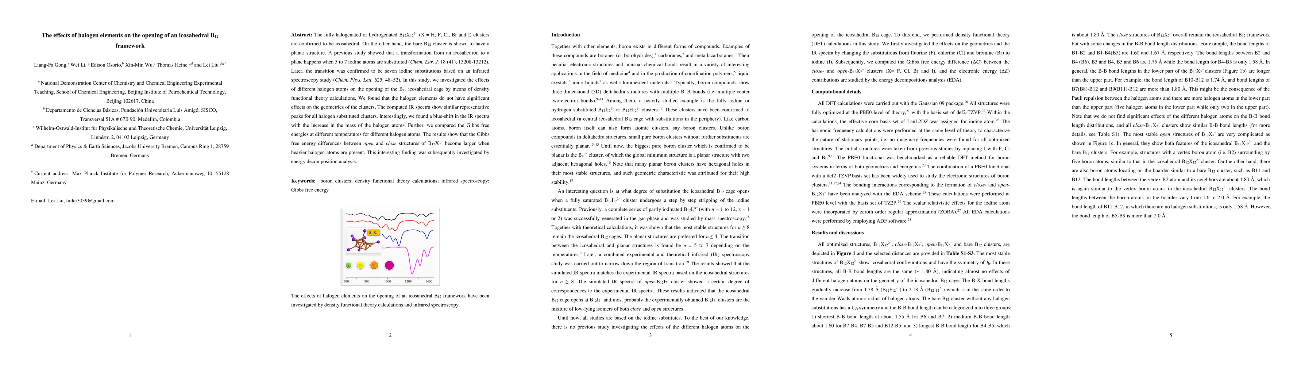 The fully halogenated or hydrogenated B12X12 (X = H, F, Cl, Br and I) clusters are confirmed to be icosahedral. On the other hand, the bare B12 cluster is shown to have a planar structure. A previous study showed that a transformation from an icosahedron to a plane happens when 5 to 7 iodine atoms are substituted. Later, the transition was confirmed to be seven iodine substitutions based on an infrared spectroscopy study. In this study, we investigated the effects of different halogen atoms on the opening of the B12 icosahedral cage by means of density functional theory calculations. We found that the halogen elements do not have significant effects on the geometries of the clusters. The computed IR spectra show similar representative peaks for all halogen substituted clusters. Interestingly, we found a blue-shift in the IR spectra with the increase in the mass of the halogen atoms. Further, we compared the Gibbs free energies at different temperatures for different halogen atoms. The results show that the Gibbs free energy differences between open and close structures of B12X7 become larger when heavier halogen atoms are present. This interesting finding was subsequently investigated by energy decomposition analysis.