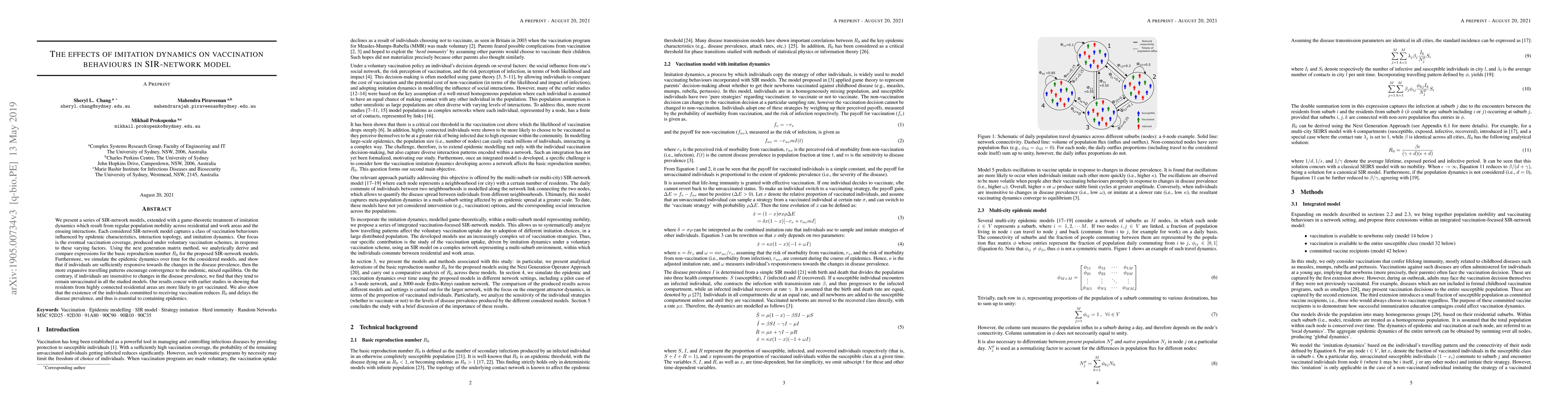 We present a series of SIR-network models, extended with a game-theoretic treatment of imitation dynamics which result from regular population mobility across residential and work areas and the ensuing interactions. Each considered SIR-network model captures a class of vaccination behaviours influenced by epidemic characteristics, interaction topology, and imitation dynamics. Our focus is the eventual vaccination coverage, produced under voluntary vaccination schemes, in response to these varying factors. Using the next generation matrix method, we analytically derive and compare expressions for the basic reproduction number $R_0$ for the proposed SIR-network models. Furthermore, we simulate the epidemic dynamics over time for the considered models, and show that if individuals are sufficiently responsive towards the changes in the disease prevalence, then the more expansive travelling patterns encourage convergence to the endemic, mixed equilibria. On the contrary, if individuals are insensitive to changes in the disease prevalence, we find that they tend to remain unvaccinated in all the studied models. Our results concur with earlier studies in showing that residents from highly connected residential areas are more likely to get vaccinated. We also show that the existence of the individuals committed to receiving vaccination reduces $R_0$ and delays the disease prevalence, and thus is essential to containing epidemics.