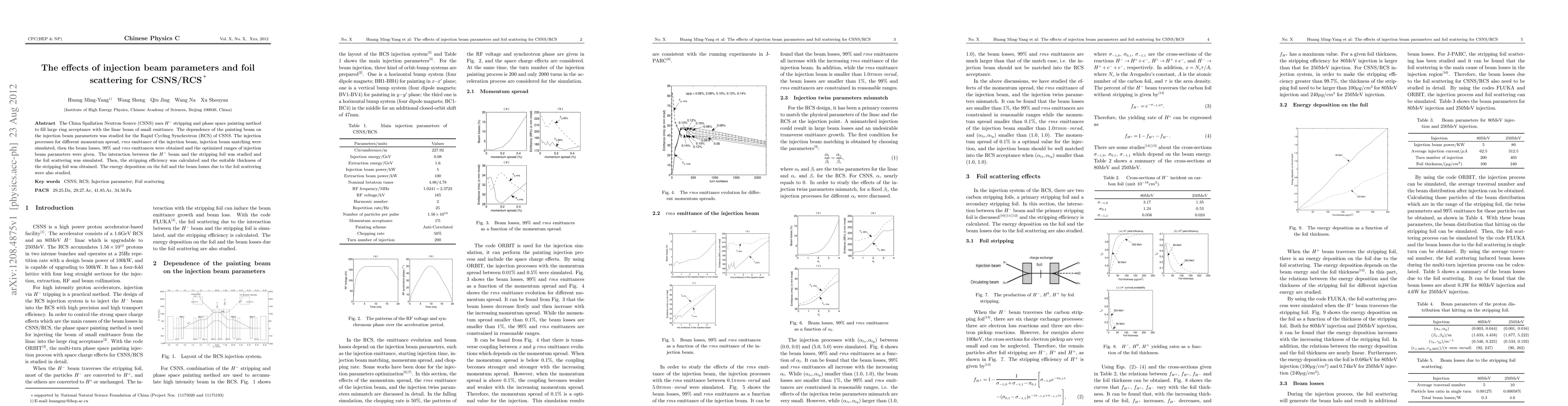 This paper investigates the effects of injection beam parameters and foil scattering on the China Spallation Neutron Source (CSNS) Rapid Cycling Synchrotron (RCS). Simulations optimized injection beam parameters to minimize losses and maximize 99% and rms emittances, while also studying foil scattering's impact on stripping efficiency and energy deposition.