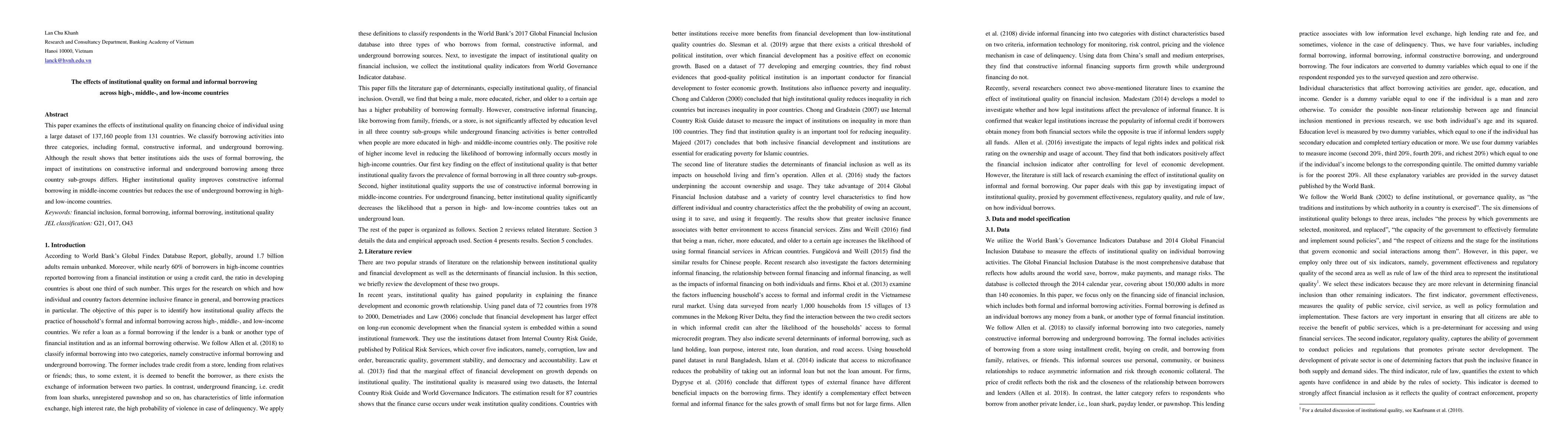 Summary: This study analyzes how institutional quality influences borrowing choices in high-, middle-, and low-income countries, revealing that better institutions enhance formal borrowing and constructive informal borrowing in middle-income countries while reducing underground borrowing in both high- and low-income countries.