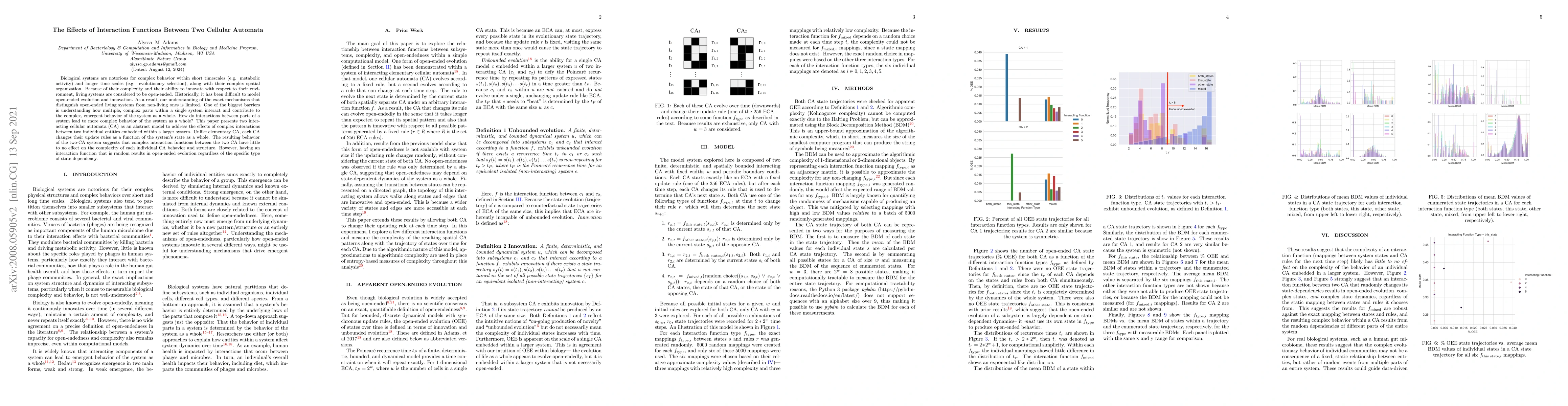 Biological systems are notorious for complex behavior within short timescales (e.g. metabolic activity) and longer time scales (e.g. evolutionary selection), along with their complex spatial organization. Because of their complexity and their ability to innovate with respect to their environment, living systems are considered to be open-ended. Historically, it has been difficult to model open-ended evolution and innovation. As a result, our understanding of the exact mechanisms that distinguish open-ended living systems from non-living ones is limited. One of the biggest barriers is understanding how multiple, complex parts within a single system interact and contribute to the complex, emergent behavior of the system as a whole. How do interactions between parts of a system lead to more complex behavior of the system as a whole? This paper presents two interacting cellular automata (CA) as an abstract model to address the effects of complex interactions between two individual entities embedded within a larger system. Unlike elementary CA, each CA changes its update rules as a function of the system's state as a whole. The resulting behavior of the two-CA system suggests that complex interaction functions between the two CA have little to no effect on the complexity of each individual CA behavior and structure. However, having an interaction function that is random results in open-ended evolution regardless of the specific type of state-dependency.