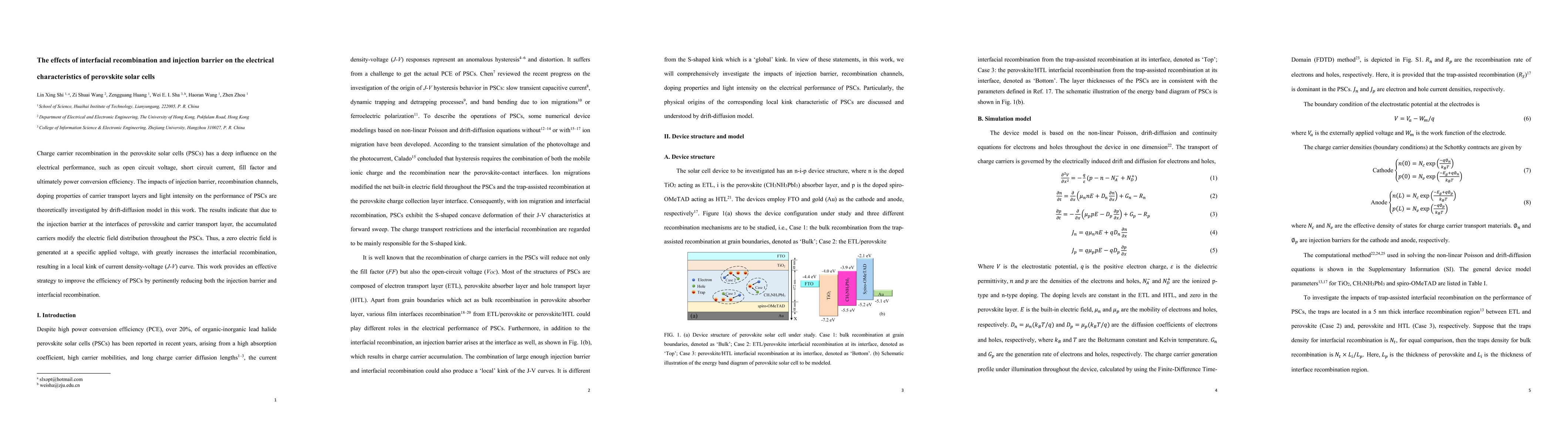 This paper investigates the impact of interfacial recombination and injection barriers on perovskite solar cells' electrical characteristics using a drift-diffusion model. It finds that injection barriers at the perovskite-carrier transport layer interfaces increase interfacial recombination, leading to a local kink in the J-V curve, and proposes strategies to improve efficiency by reducing these barriers.