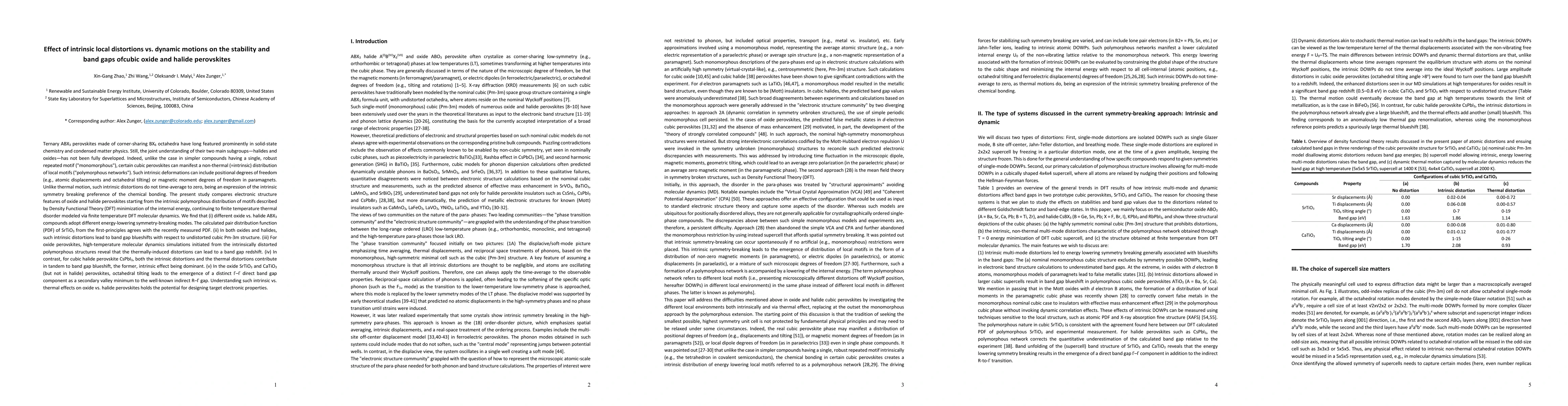Corner-shared ABX$_3$ perovskites have long featured prominently in solid-state chemistry and condensed matter physics. Still, the joint understanding of their two main subgroups-halides and oxides-has not been fully developed. Indeed, unlike the case that compounds having a single repeated motif ("monomorphous"), certain cubic perovskites can manifest a non-thermal distribution of local motifs ("polymorphous networks"). Such intrinsic deformations can include positional degrees of freedom. Unlike thermal motion, such intrinsic distortions do not time-average to zero. The present study compares electronic structure features of oxide and halide perovskites starting from the intrinsic polymorphous network described by DFT minimization of the internal energy, continuing to finite temperature thermal disorder using AIMD. We find that (i) different oxide vs. halide ABX$_3$ compounds adopt different energy-lowering distortion modes. The DFT calculated pair distribution function (PDF) of SrTiO$_3$ agrees with the recently measured PDF. (ii) In both oxides and halides, such intrinsic distortions lead to bandgap blueshifts with respect to monomorphous structure. (iii) For oxide perovskites, high-temperature AIMD simulations initiated from the polymorphous structures reveal that the thermally-induced distortions can lead to a bandgap redshift. (iv) In contrast, for cubic CsPbI$_3$, both the intrinsic distortions and the thermal distortions contribute in tandem to bandgap blueshift, the former, intrinsic effect being dominant. (v) In the oxide SrTiO$_3$ and CaTiO$_3$ (but not in halide), octahedral tilting leads to the emergence of a distinct $\Gamma$-$\Gamma$ direct bandgap component as a secondary valley minimum to the well-known indirect R-$\Gamma$ gap. Understanding such intrinsic vs. thermal effects on oxide vs. halide perovskites holds the potential for designing target electronic properties.