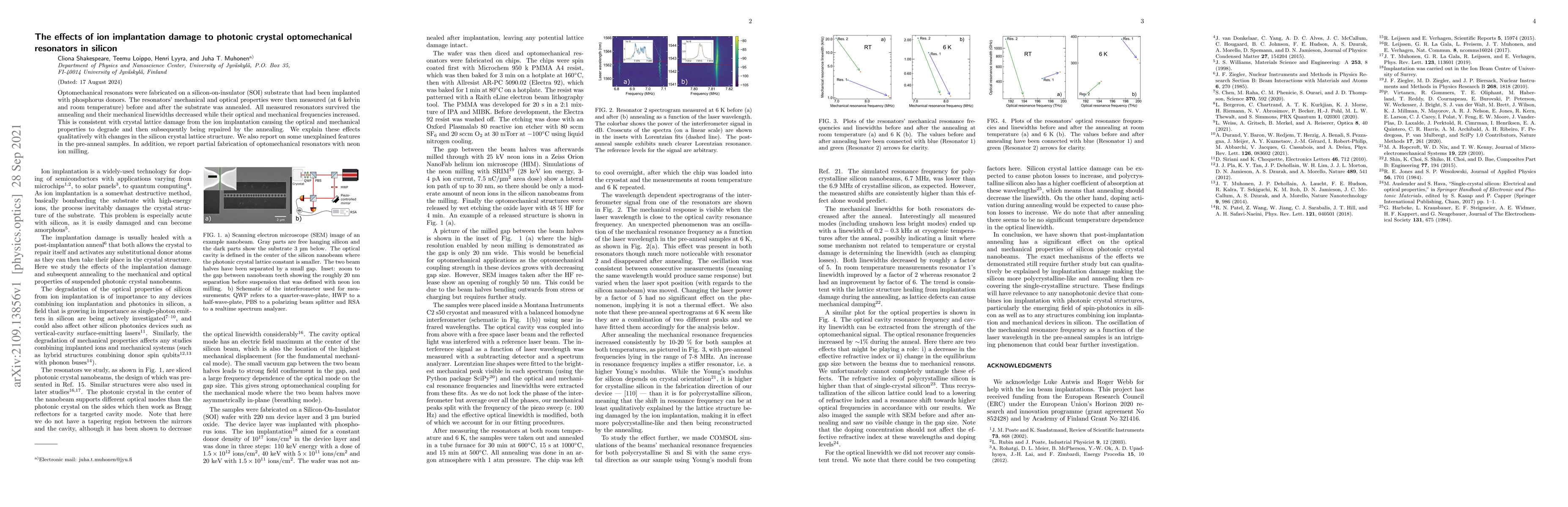 This paper investigates the impact of phosphorus ion implantation on silicon-based photonic crystal optomechanical resonators, finding that annealing repairs lattice damage, leading to improved mechanical linewidths and increased optical and mechanical frequencies. Some unexplained phenomena in pre-anneal samples and partial fabrication via neon ion milling are also reported.