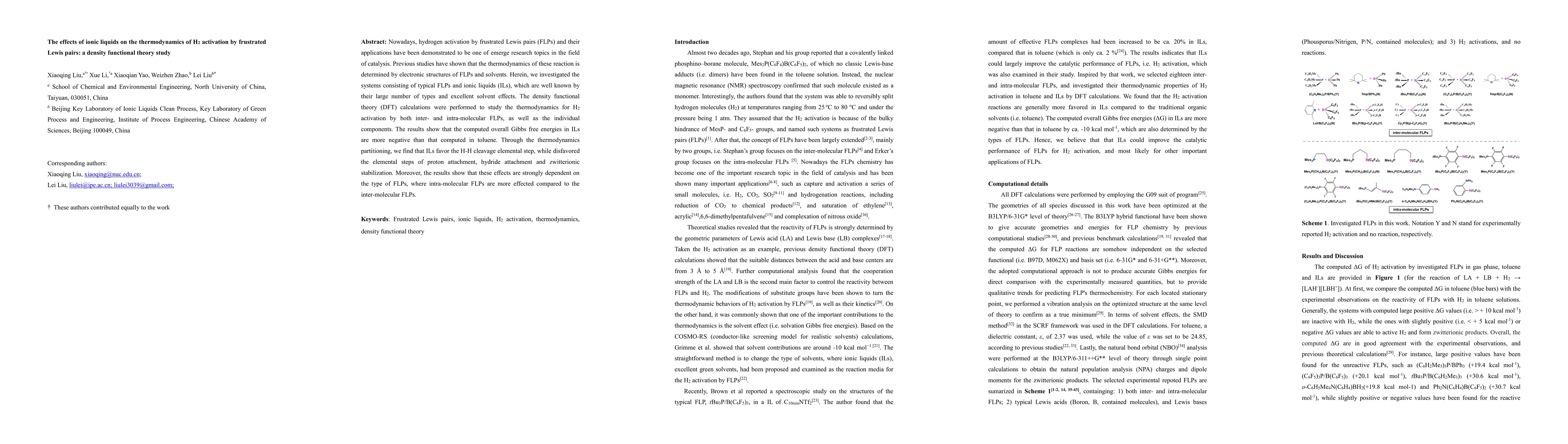 This study uses density functional theory to investigate how ionic liquids affect the thermodynamics of hydrogen activation by frustrated Lewis pairs. It finds that ionic liquids favor H-H cleavage over other elemental steps.