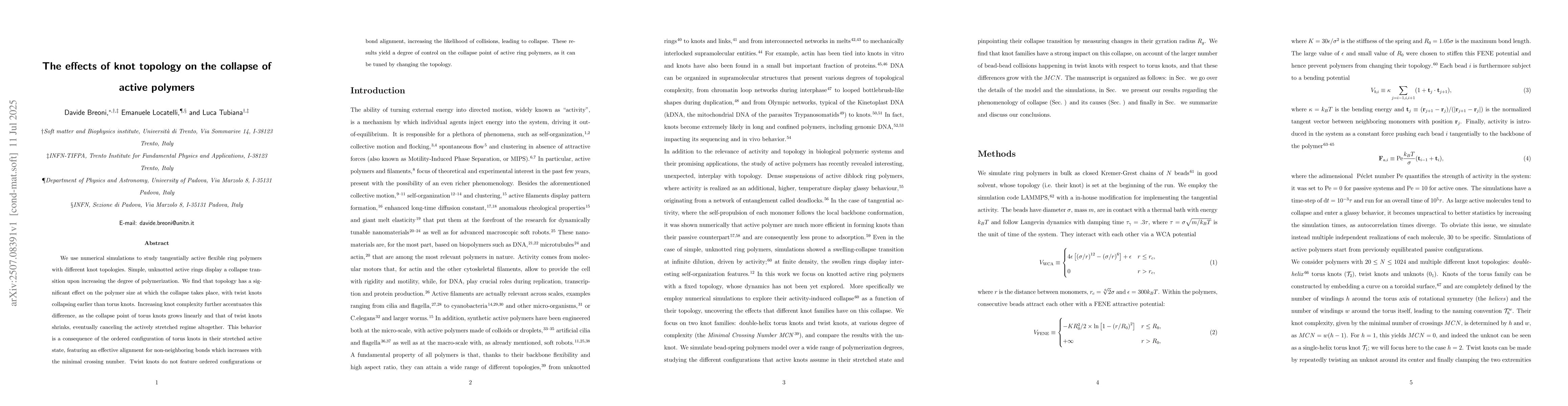 We use numerical simulations to study tangentially active flexible ring polymers with different knot topologies. Simple, unknotted active rings display a collapse transition upon increasing the degree of polymerization. We find that topology has a significant effect on the polymer size at which the collapse takes place, with twist knots collapsing earlier than torus knots. Increasing knot complexity further accentuates this difference, as the collapse point of torus knots grows linearly and that of twist knots shrinks, eventually canceling the actively stretched regime altogether. This behavior is a consequence of the ordered configuration of torus knots in their stretched active state, featuring an effective alignment for non-neighboring bonds which increases with the minimal crossing number. Twist knots do not feature ordered configurations or bond alignment, increasing the likelihood of collisions, leading to collapse. These results yield a degree of control on the collapse point of active ring polymers, as it can be tuned by changing the topology.