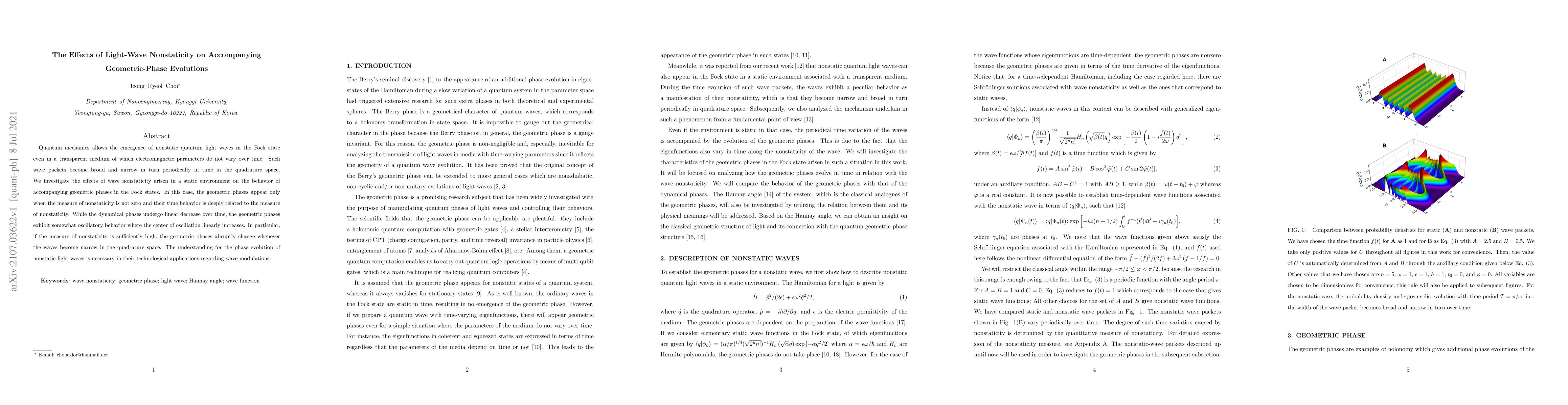 Quantum mechanics allows the emergence of nonstatic quantum light waves in the Fock state even in a transparent medium of which electromagnetic parameters do not vary over time. Such wave packets become broad and narrow in turn periodically in time in the quadrature space. We investigate the effects of wave nonstaticity arisen in a static environment on the behavior of accompanying geometric phases in the Fock states. In this case, the geometric phases appear only when the measure of nonstaticity is not zero and their time behavior is deeply related to the measure of nonstaticity. While the dynamical phases undergo linear decrease over time, the geometric phases exhibit somewhat oscillatory behavior where the center of oscillation linearly increases. In particular, if the measure of nonstaticity is sufficiently high, the geometric phases abruptly change whenever the waves become narrow in the quadrature space. The understanding for the phase evolution of nonstatic light waves is necessary in their technological applications regarding wave modulations.