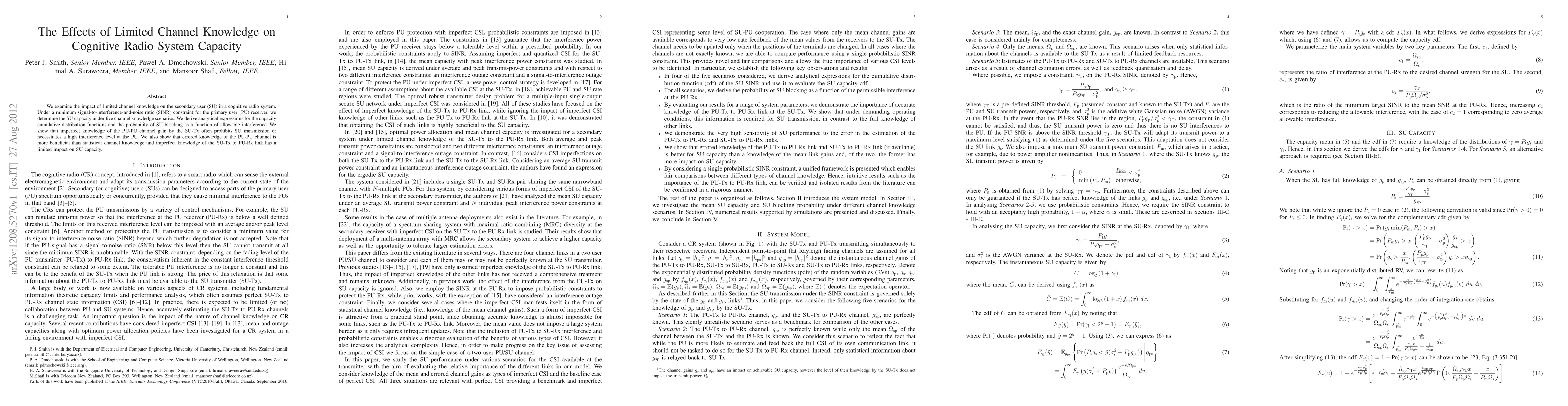 We examine the impact of limited channel knowledge on the secondary user (SU) in a cognitive radio system. Under a minimum signal-to-interference-and-noise ratio (SINR) constraint for the primary user (PU) receiver, we determine the SU capacity under five channel knowledge scenarios. We derive analytical expressions for the capacity cumulative distribution functions and the probability of SU blocking as a function of allowable interference. We show that imperfect knowledge of the PU-PU channel gain by the SU-Tx often prohibits SU transmission or necessitates a high interference level at the PU. We also show that errored knowledge of the PU-PU channel is more beneficial than statistical channel knowledge and imperfect knowledge of the SU-Tx to PU-Rx link has a limited impact on SU capacity.