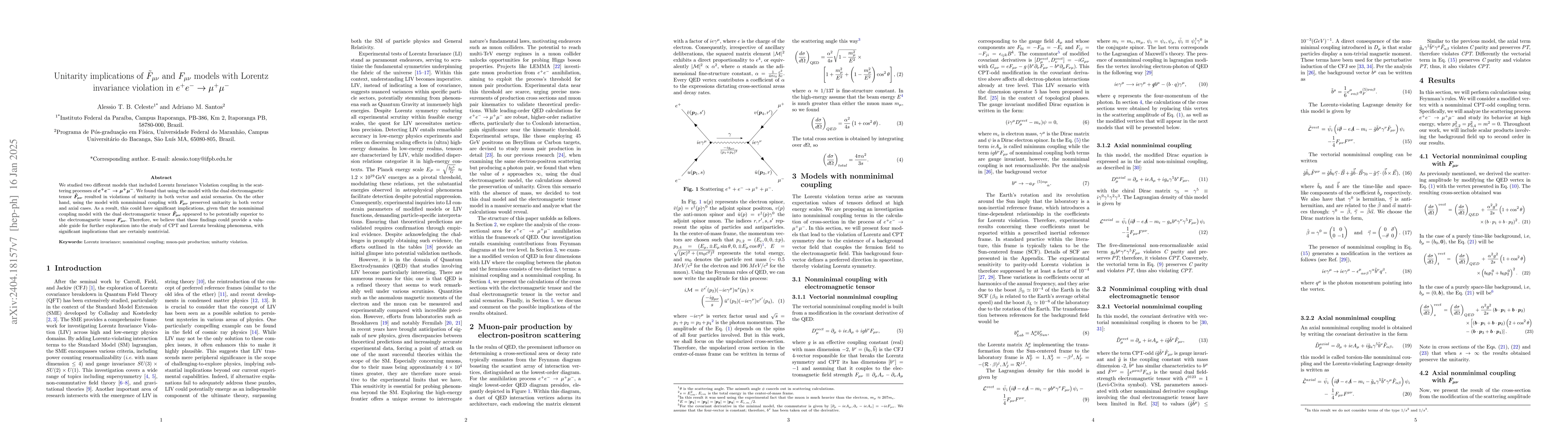 We investigated two distinct models incorporating LIV with nonminimal coupling in scattering processes of $e^+e^- \rightarrow \mu^+\mu^-$. We verified that employing the model with dual electromagnetic tensor $(\tilde{F}_{\mu\nu})$ led to violations of unitarity in both vector and axial scenarios. Conversely, utilizing the model with nonminimal coupling with $(F_{\mu\nu})$ preserved unitarity in both vector and axial cases. Consequently, this could hold promising implications, considering that the nonminimal coupling model with dual electromagnetic tensor $\tilde {F}_{\mu\nu}$ appeared potentially superior to the electromagnetic tensor $F_{\mu\nu}$. Hence, we anticipate that these findings might offer a valuable roadmap for further exploration into the investigation of CPT and Lorentz breaking phenomena, with phenomenological implications that are certainly not trivial.